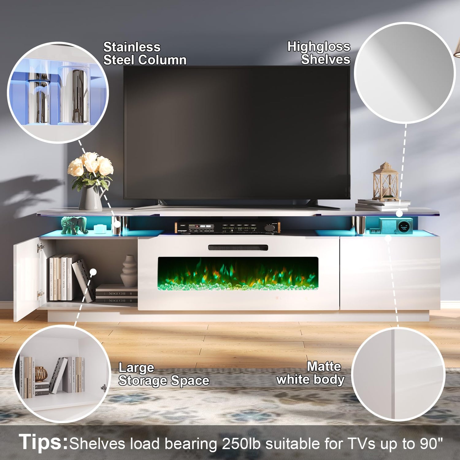 - 80" 2-tier TV console with 40" touchscreen electric fireplace features 8 colors realistic flame & 5 levels brightness & 12 colors LED light customize the personalized lighting atmosphere