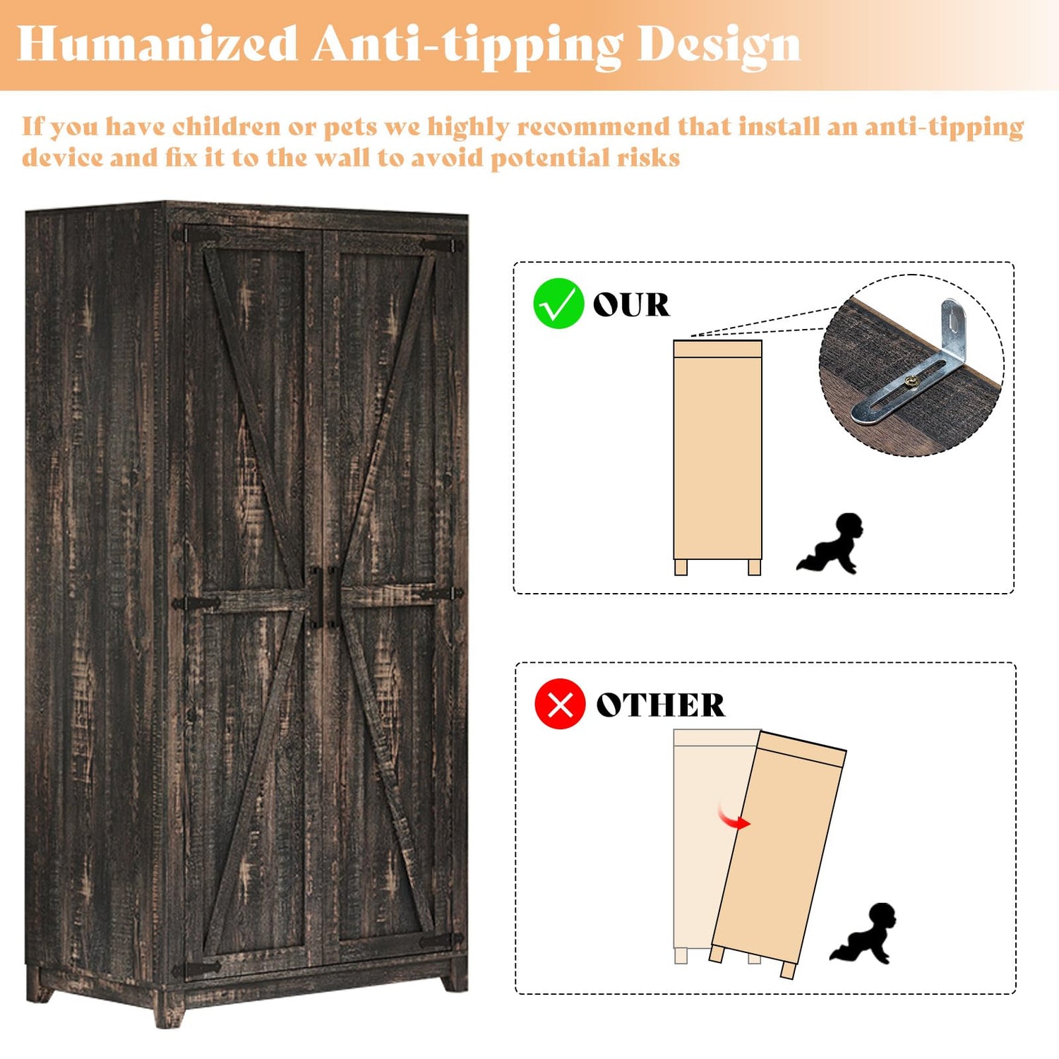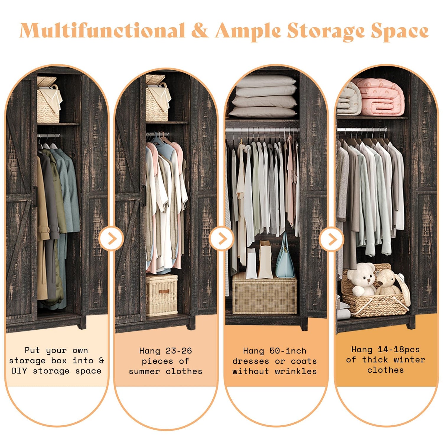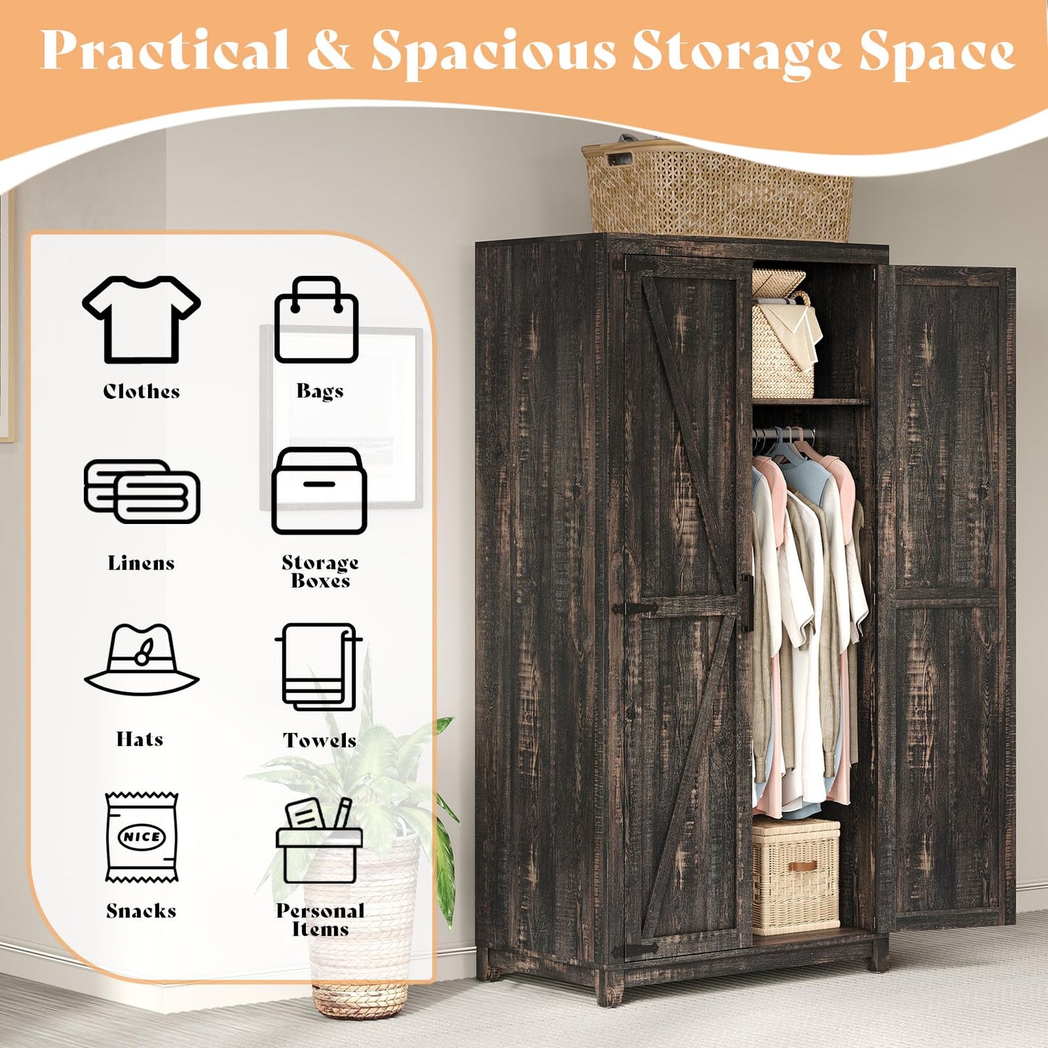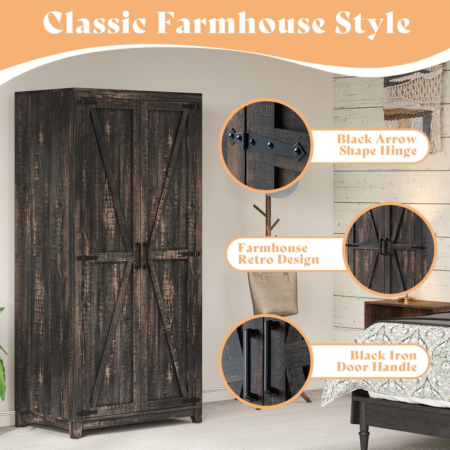 - 【Farmhouse Style Armoire】Popular farmhouse design with black iron fittings add a retro style and aesthetically pleasing. Retain the original basic concepts of naturalness, simplicity, and practicality