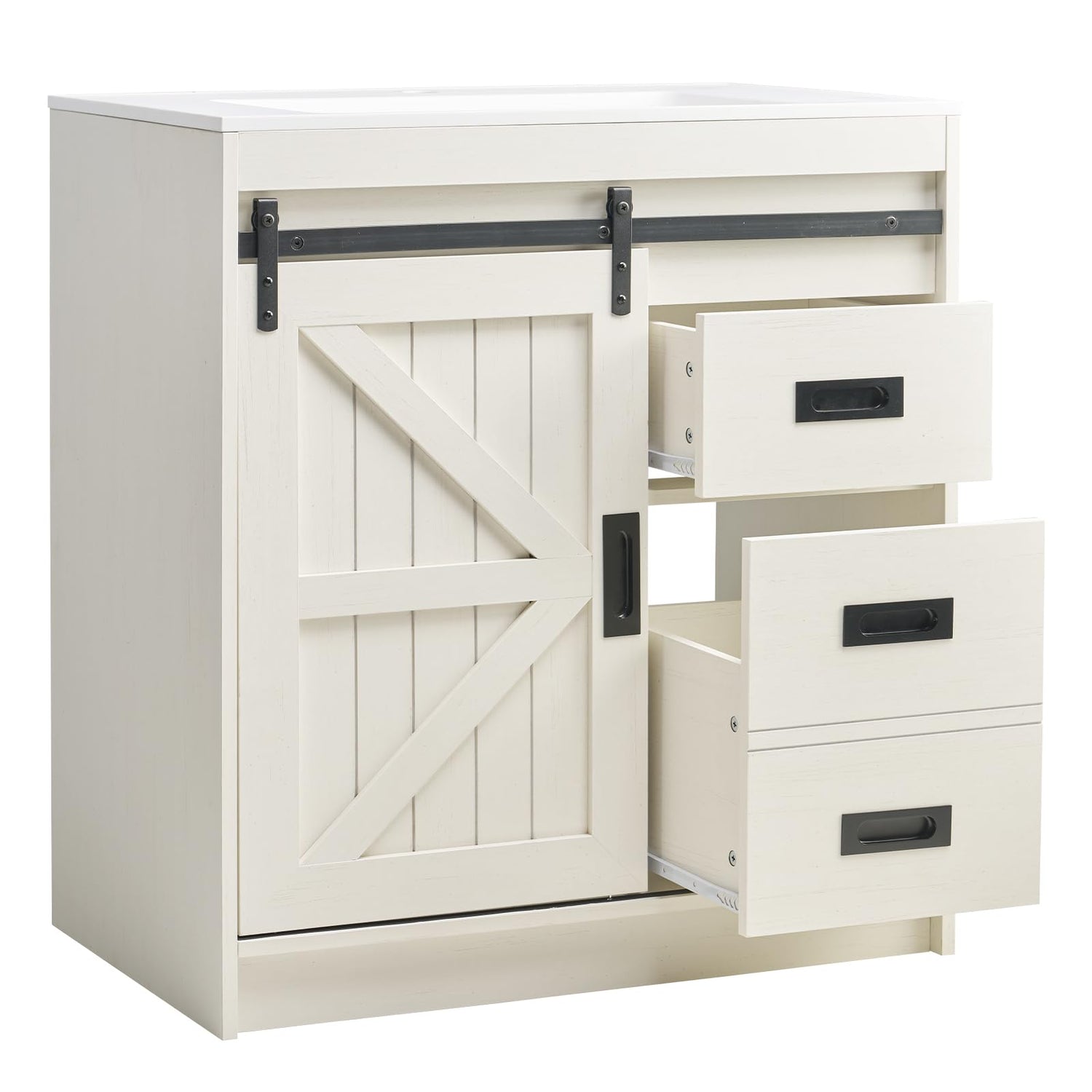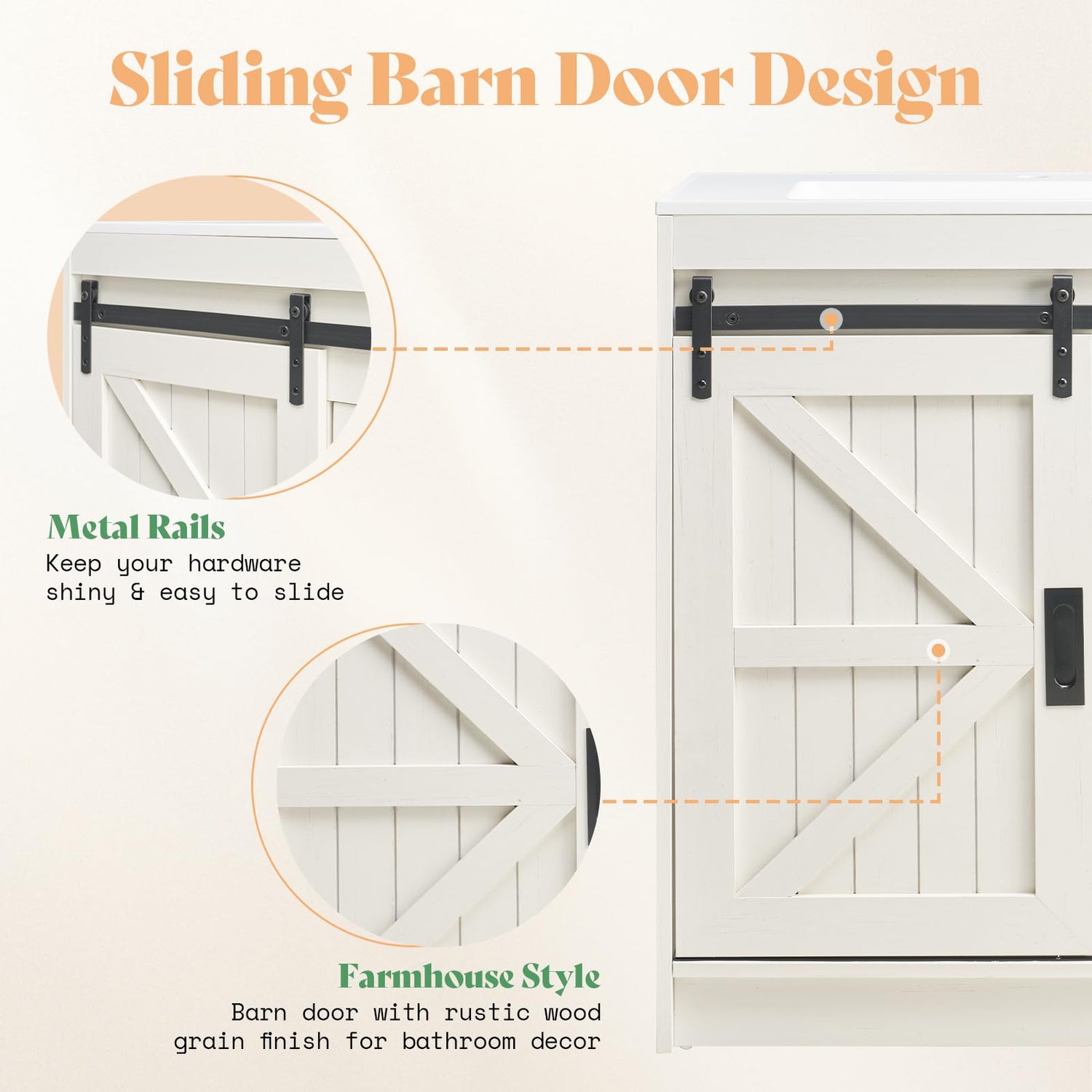 AMERLIFE Farmhouse Bathroom Vanity with Sink Combo, 31in Sliding Barn Door Bathroom Vanity Cabinet Set with Storage Drawers, Metal Handles, Small Single Bath Storage Vanity Sink, Antique White