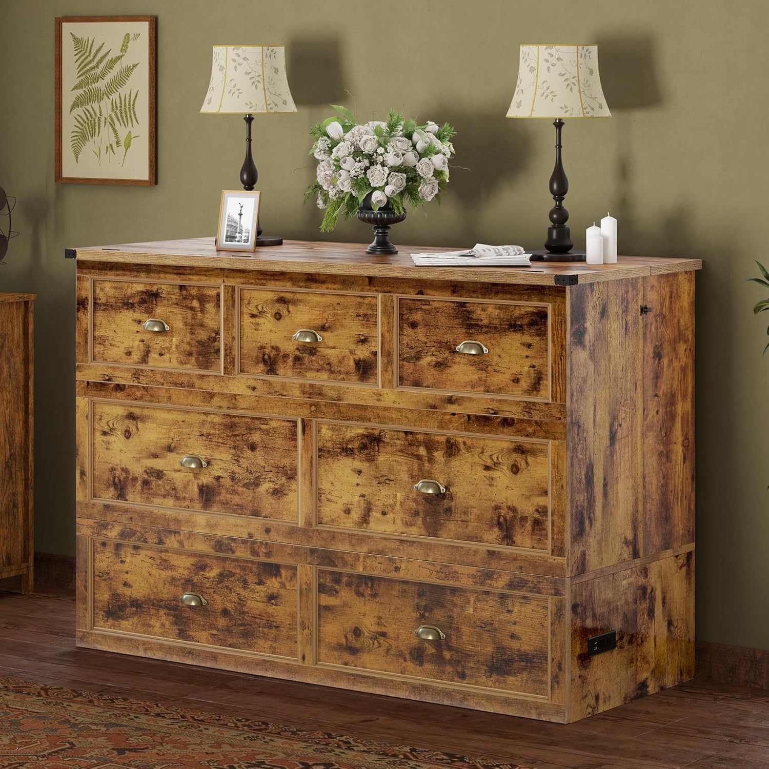AMERLIFE Farmhouse Murphy Bed, Full Size Wooden Cabinet with Charging Station and Storage Drawer for Bedroom/Office/Guest Room, Rustic Brown