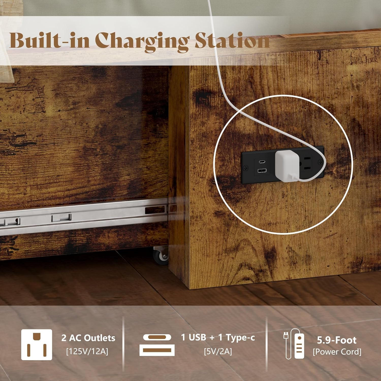 - 【Spacious Storage Space】Wide tabletop holds your decor or daily essentials, while the large drawer underneath keeps bedding and off-season clothing neatly tucked away. A hidden compartment inside fits a tri-fold mattress (not included), maximizing space efficiency