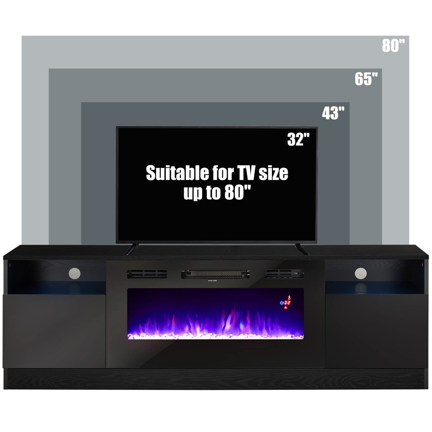 - Overall Dimensions: 70" W x 23" H x 13.8"D. For flat curved screen TV up to 80 inches. Electric fireplace: 36"x18.5". 750W/1500W modes perform adjustable power capacity accordingly for both warm and energy-saving purposes