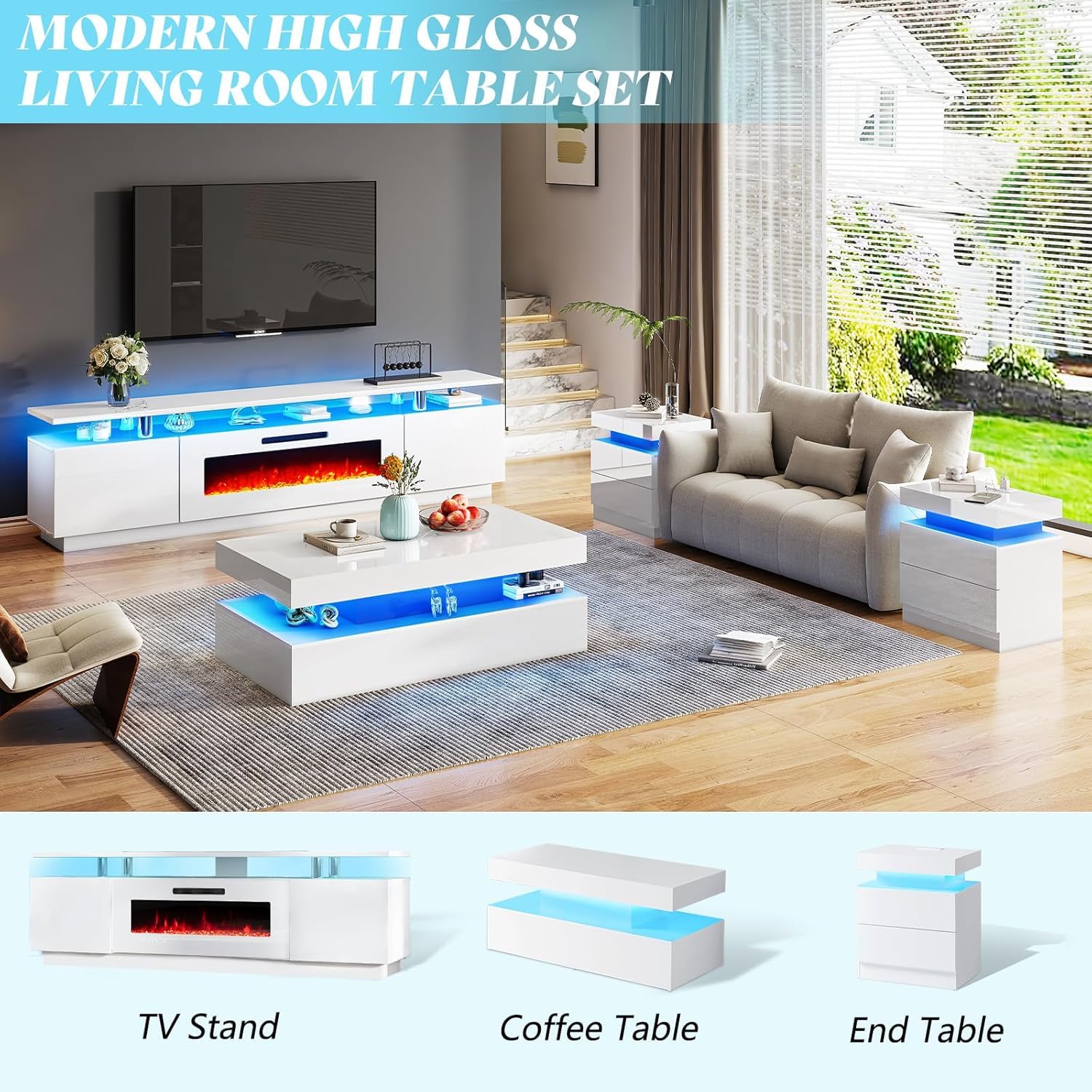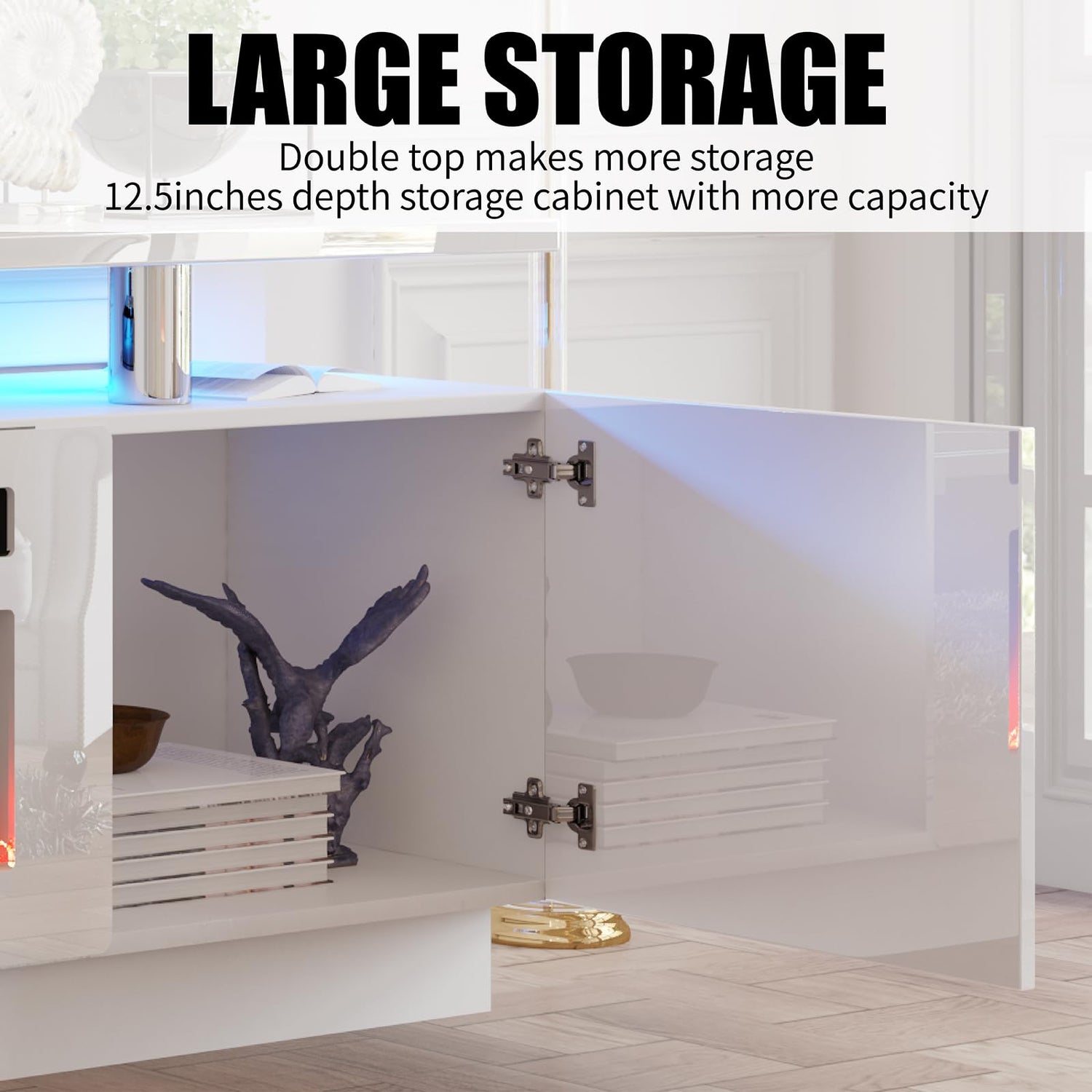 - High gloss entertainment center top and front doors with matte white body show luxury and modernity. LED kit includes 7 changeable colors to custom a personalized dazzle lighting atmosphere and unique experience