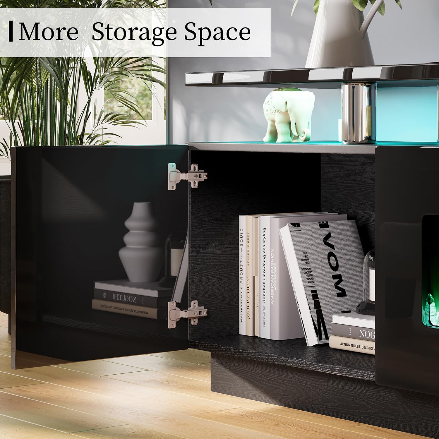 - 2 tier unique design & 4 stainless supported open storage shelves hold kinds of media tools or decorations, making the TV cabinet more tidy and personalized. 2 large cabinets provide ample space for your cherished CDs, books, etc