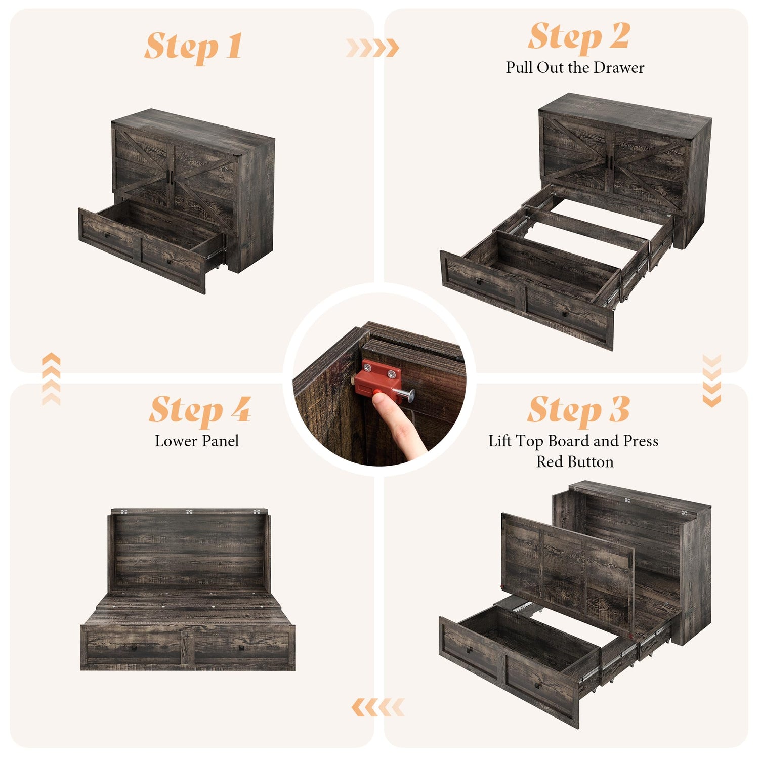 AMERLIFE Full Murphy Bed Cabinet with Charging Station and Storage, Farmhouse Foldable Platform Bed for Guest Room, Office, Small Spaces, Black Oak