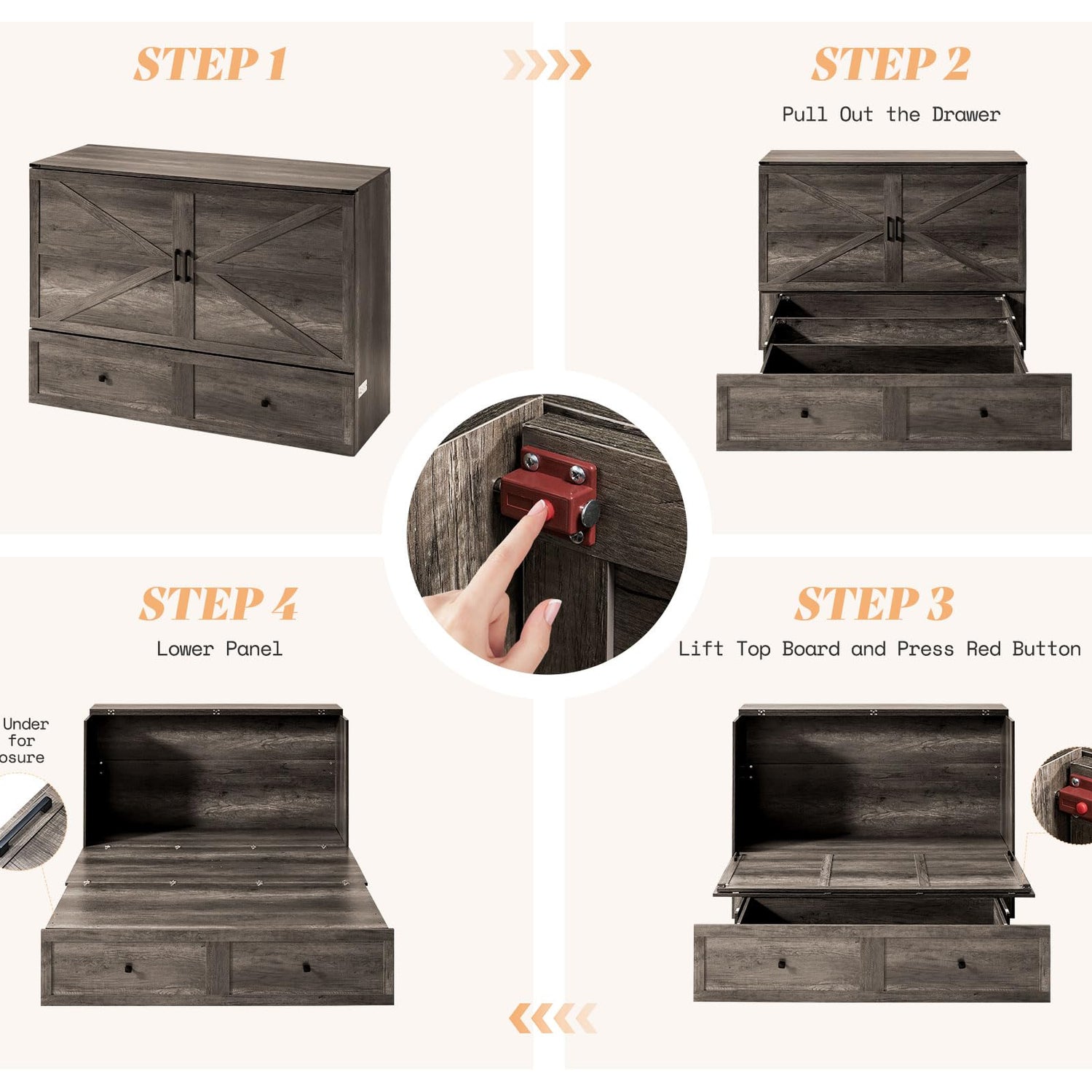 AMERLIFE Full Murphy Bed with Storage & Charging Station, Farmhouse Murphy Cabinet with Foldable Panel, Noisy Free, for Guest Bedroom, Living Room, Office, Rustic Gray
