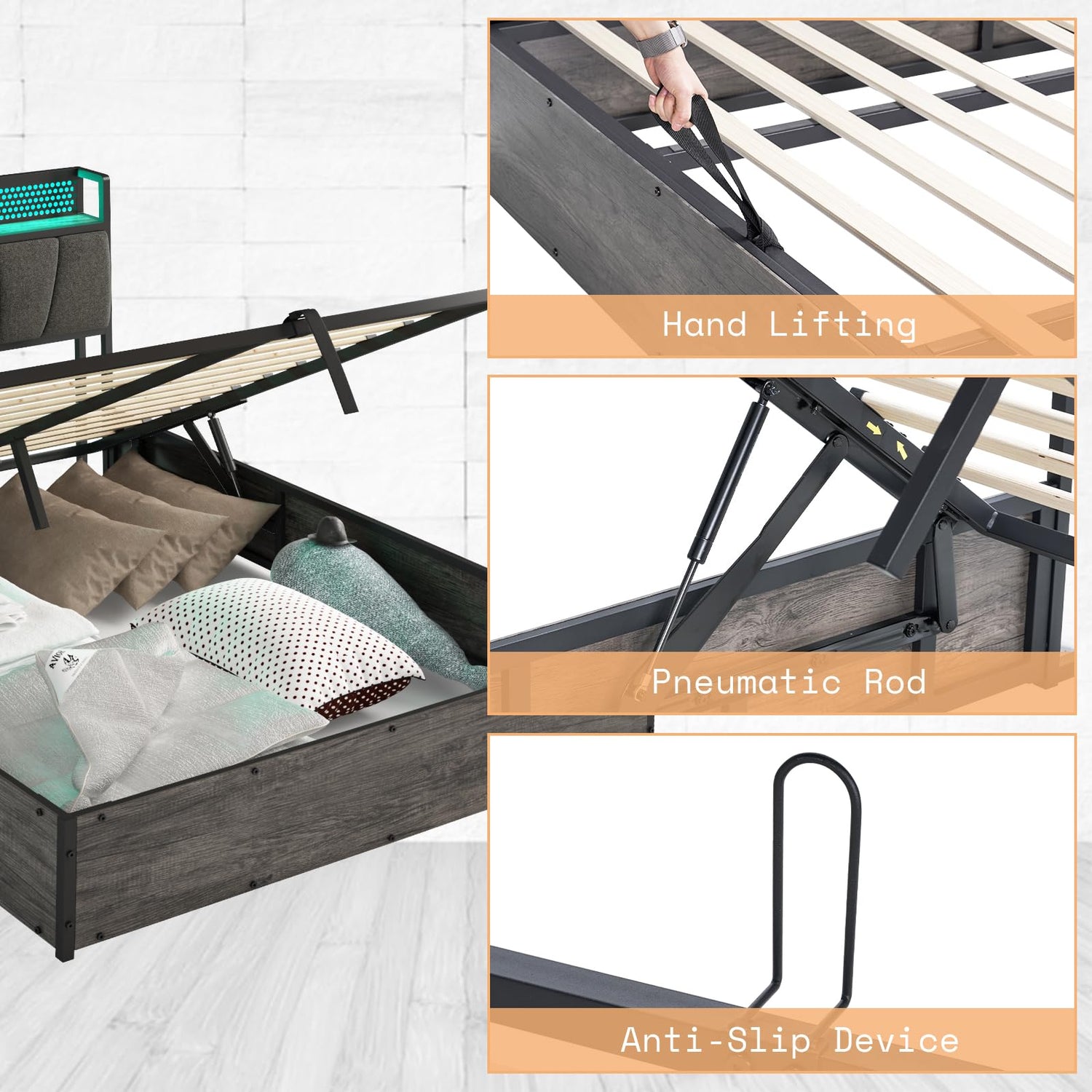 - 【Effortless Storage】 Gas-lift mechanism makes lifting the bed frame easy, revealing ample under-bed storage space. With mattress anti-slip and fixation devices, keep your belongings organized and secure.
