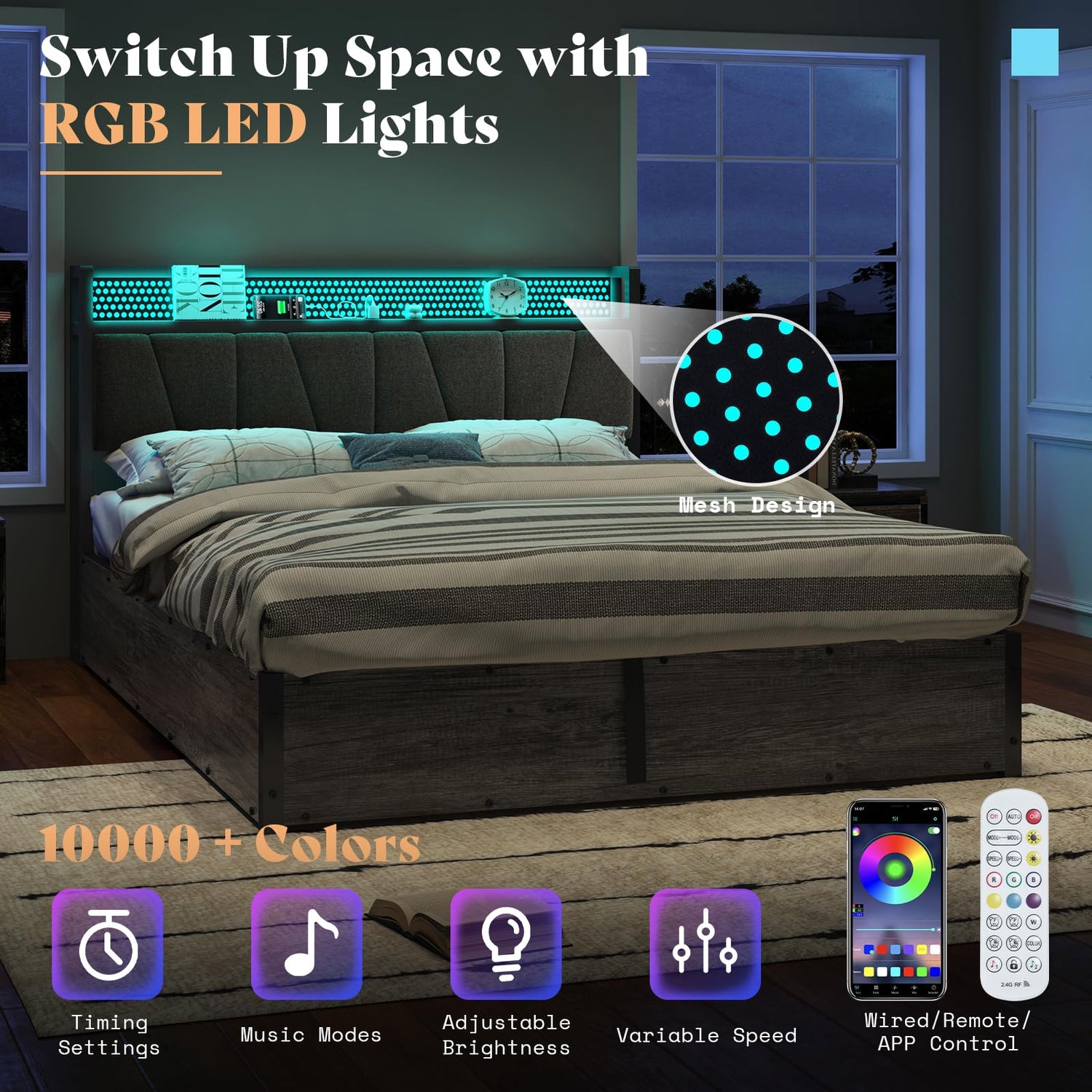 - 【Customizable LED】Elevate bedroom ambiance with RGB LED bed frame. Over 1000+ colors, adjust brightness, and enjoy music mode, controllable via remote control, app, or manual control.