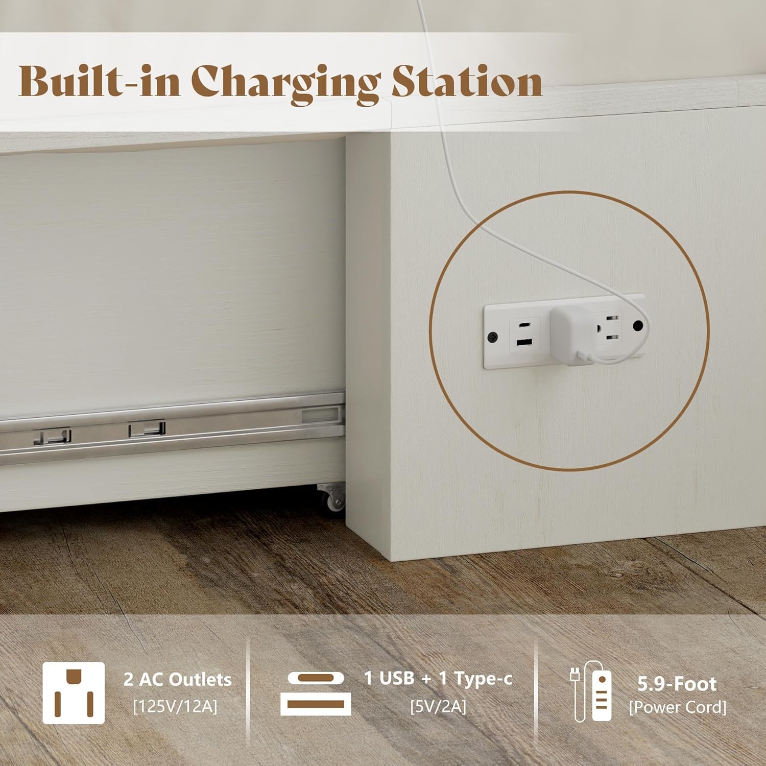 - 【Spacious Storage Space】Wide tabletop holds your decor or daily essentials, while the large drawer underneath keeps bedding and off-season clothing neatly tucked away. A hidden compartment inside fits a tri-fold mattress (not included), maximizing space efficiency