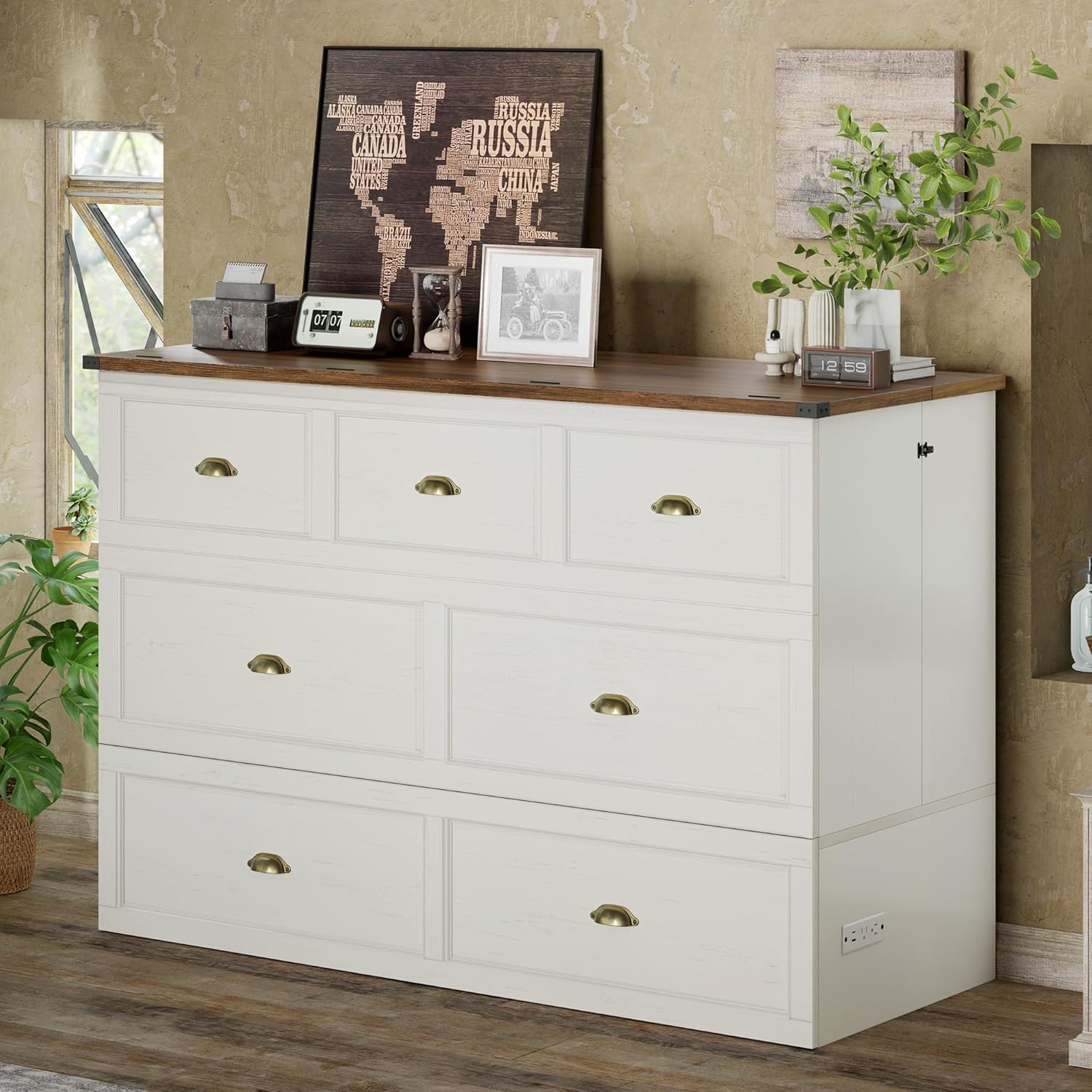 AMERLIFE Full Size Murphy Bed, Farmhouse Wooden Cabinet with Charging Station and Storage Drawer for Bedroom/Office/Guest Room, White+Barnwood
