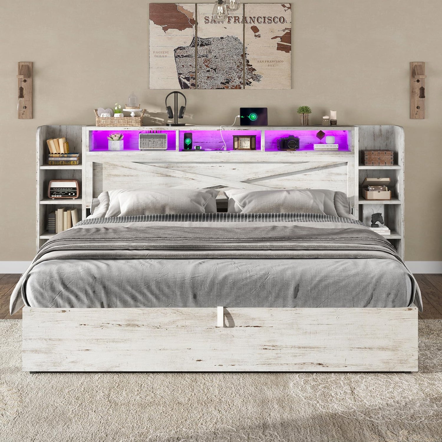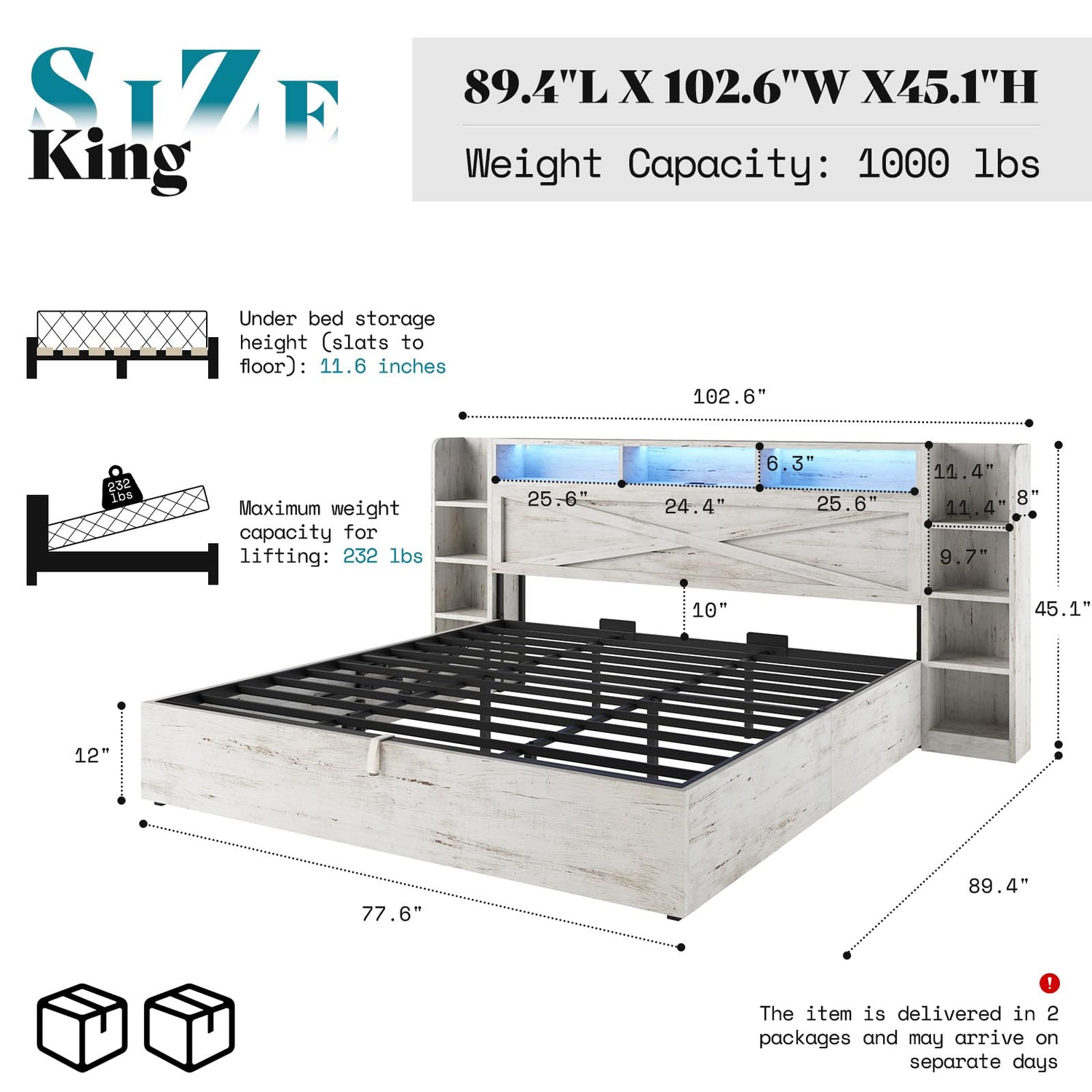 AMERLIFE King Size Lift Up Storage Bed Frame, 45.1" LED Bed Frame with 2 Side Shelves & Bookcase Headboard, Farmhouse Wood Platform Bed with Charging Station, No Box Spring Needed, Distressed White