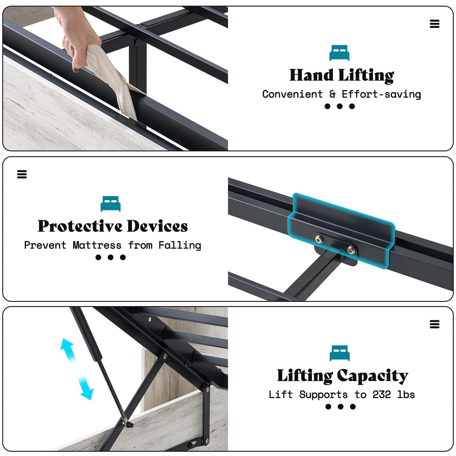 - 【Lift Up Bed Frame】Offers spacious under-bed storage for bulky items and a bookcase headboard to keep daily essentials within easy reach. Features 2 4-tier side shelves, which can be detached by unscrewing for flexible use