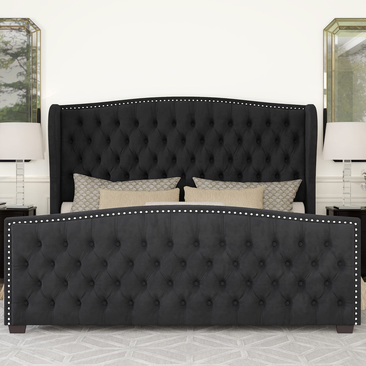 AMERLIFE King Size Platform Bed Frame, Velvet Upholstered Bed with Deep Button Tufted & Nailhead Trim Wingback Headboard/No Box Spring Needed/Black
