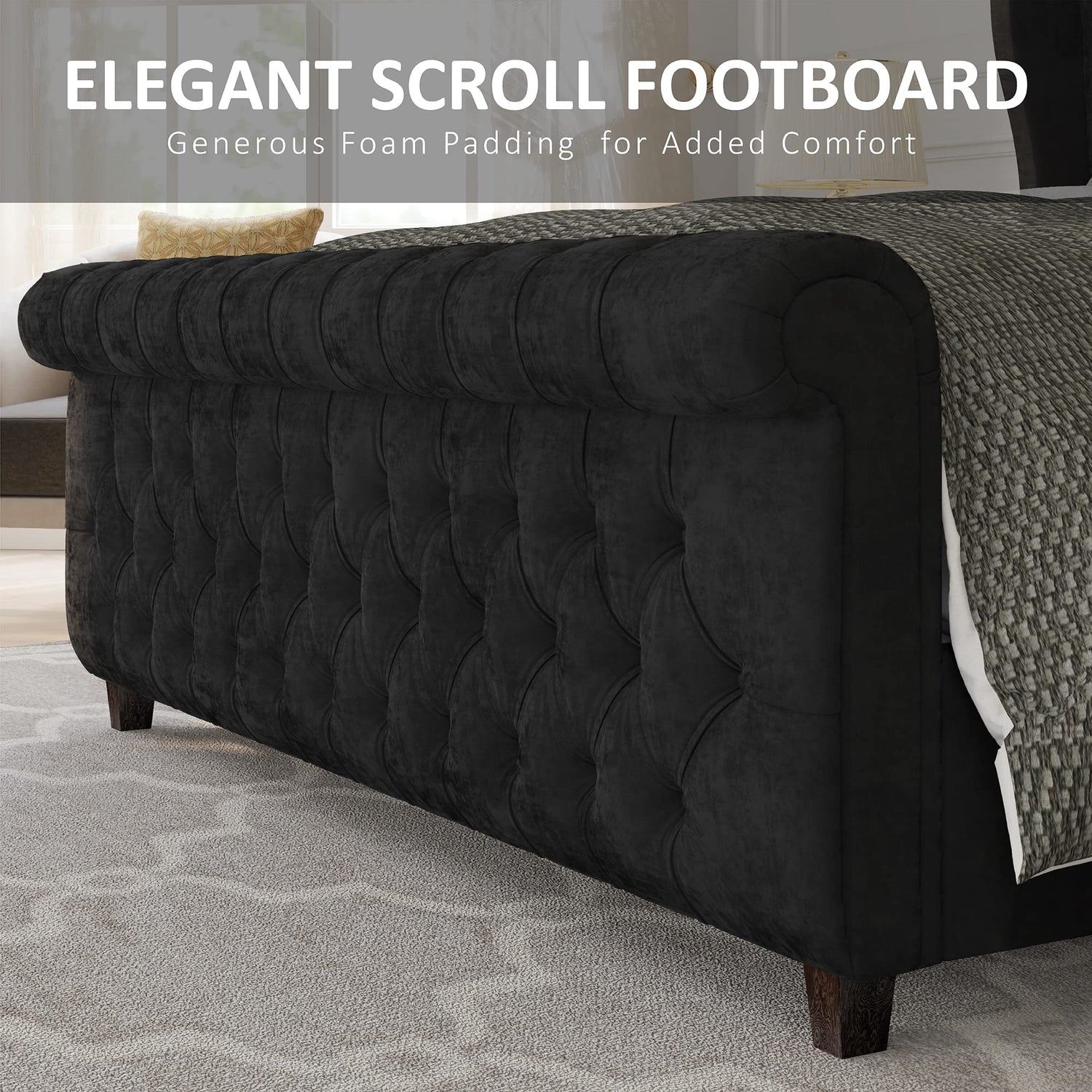 - CONTEMPORARY & LUXURY - Combines stylish buttoned detailing with striking rolled headboard & footboard design, this king size sleigh bed is easily mixed with any bedroom style or color scheme.