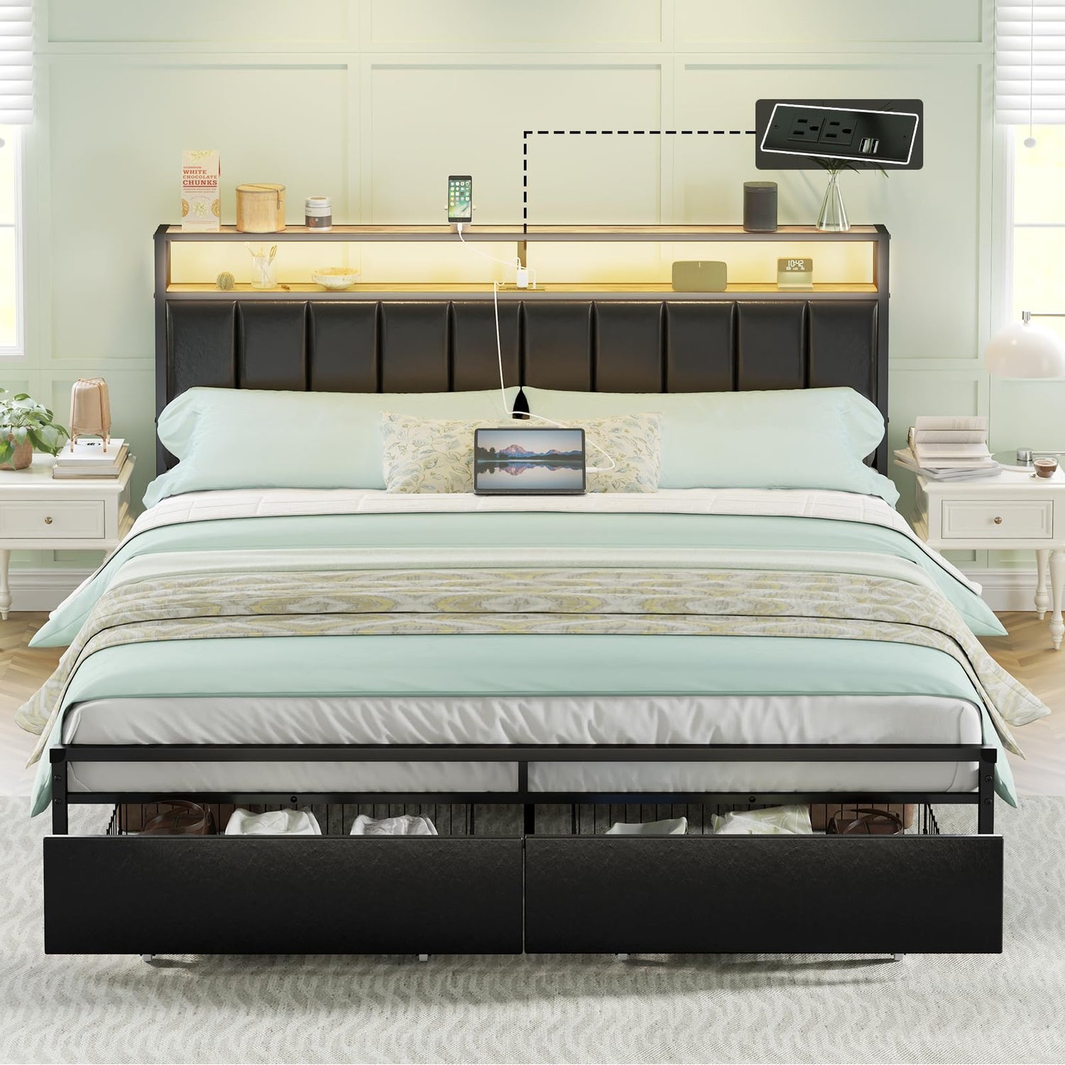 AMERLIFE LED Bed Frame with Drawers, King Platform Bed Frame with 2-Tier Storage & Leather Upholstered & Charging Station Headboard, No Box Spring Needed, Noise Free, Easy Assembly, Black