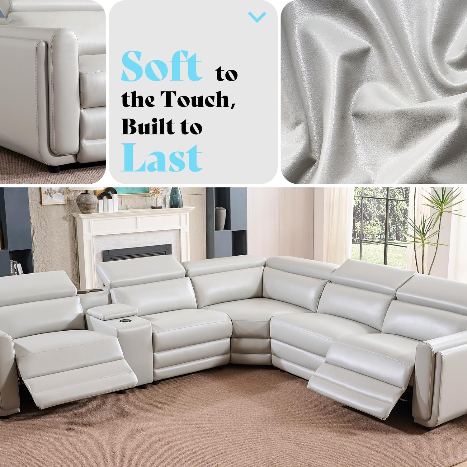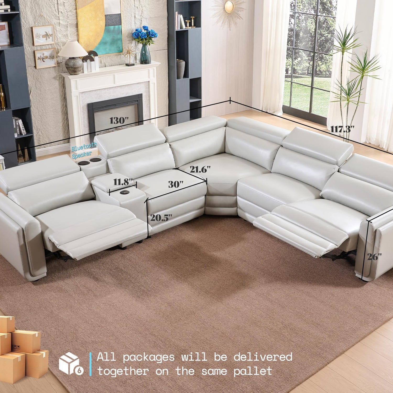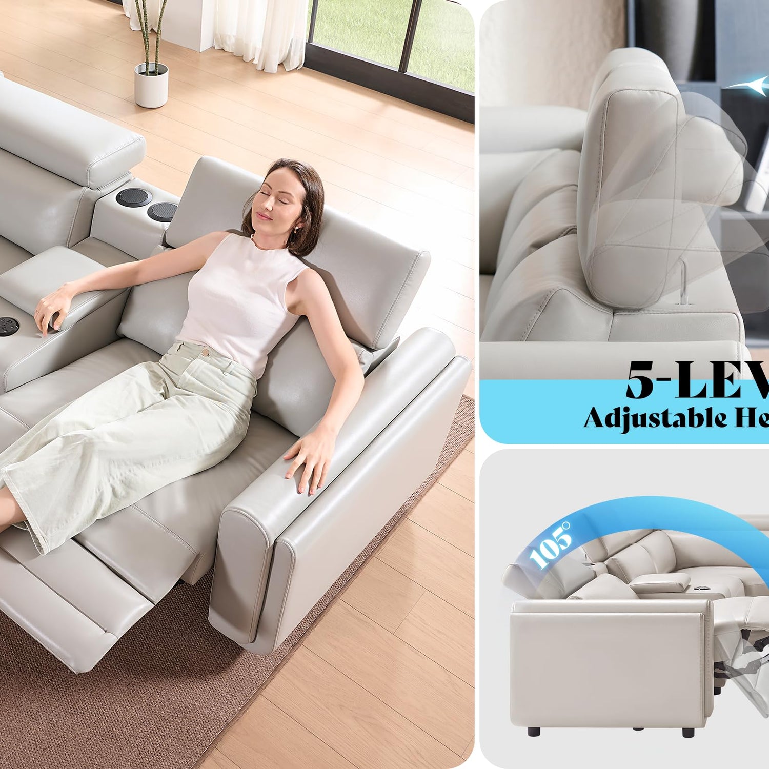 AMERLIFE Power Recliner Sofa, 129 Inch Oversized Reclining Sofa with Console & Speaker, 5 Seats L Shaped Sectional Couch for Living Room, Light Grey Leather