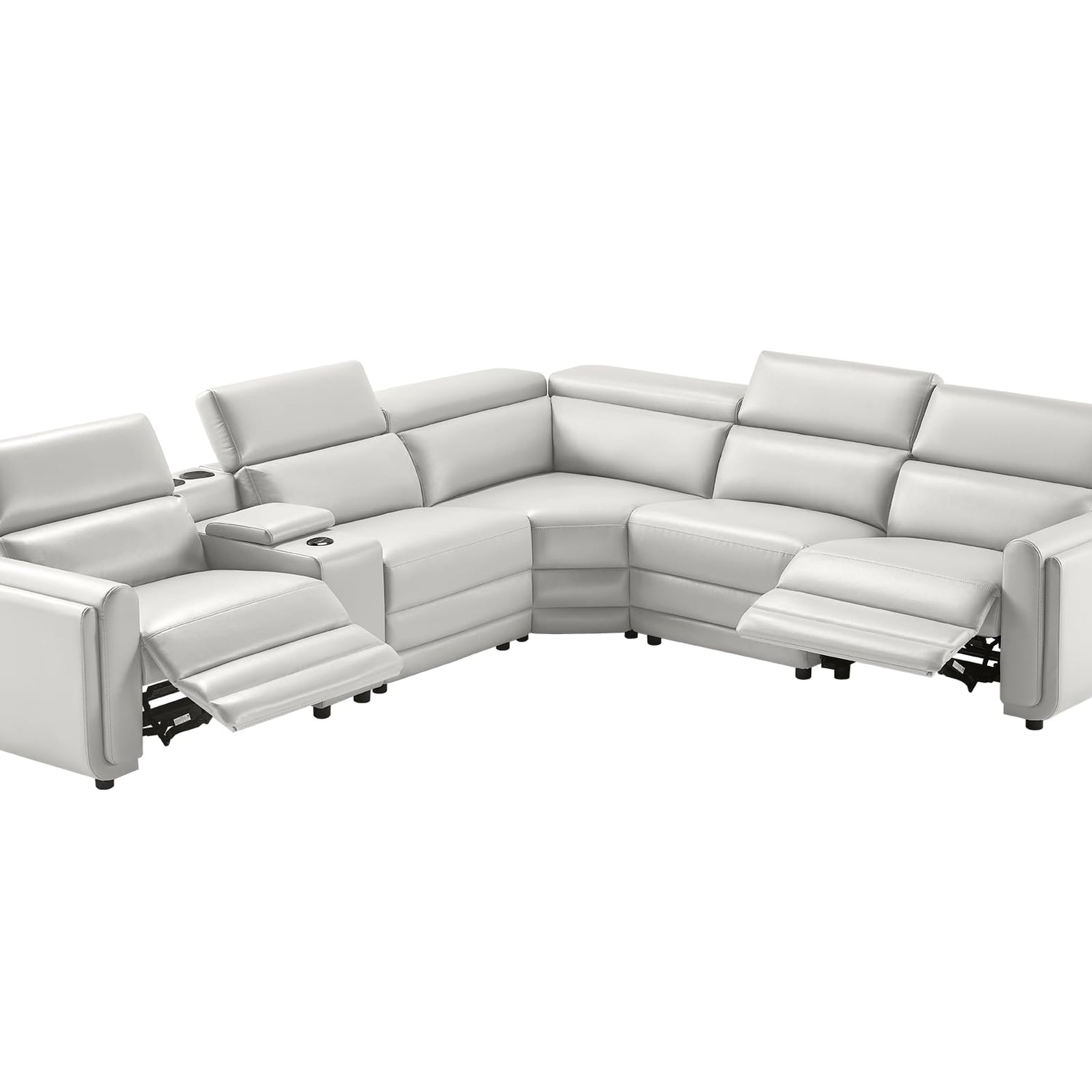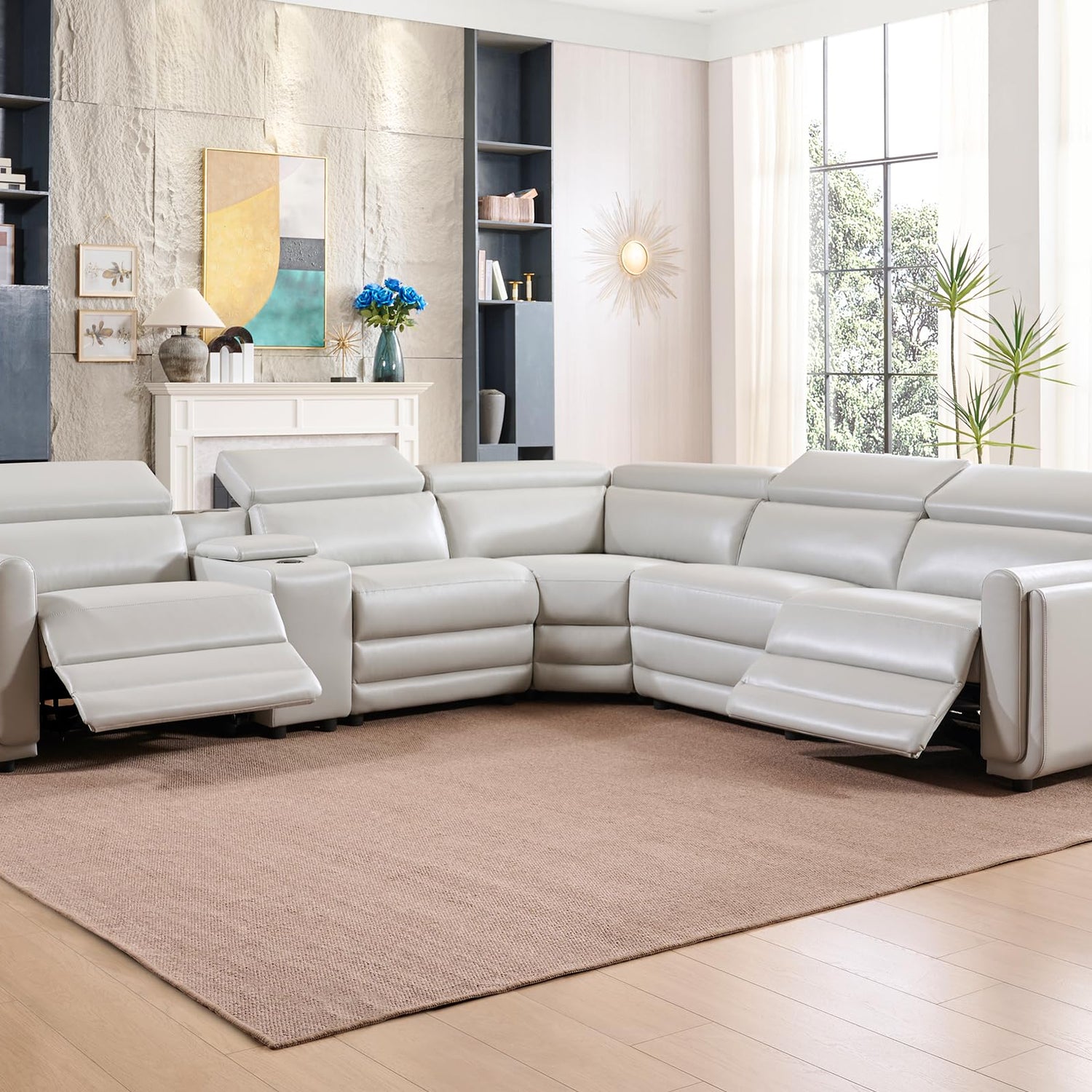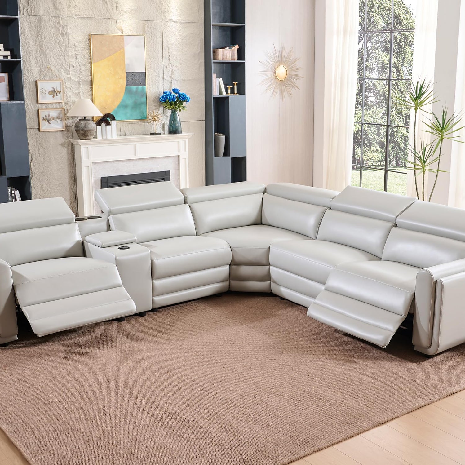 AMERLIFE Power Recliner Sofa, 129 Inch Oversized Reclining Sofa with Console & Speaker, 5 Seats L Shaped Sectional Couch for Living Room, Light Grey Leather