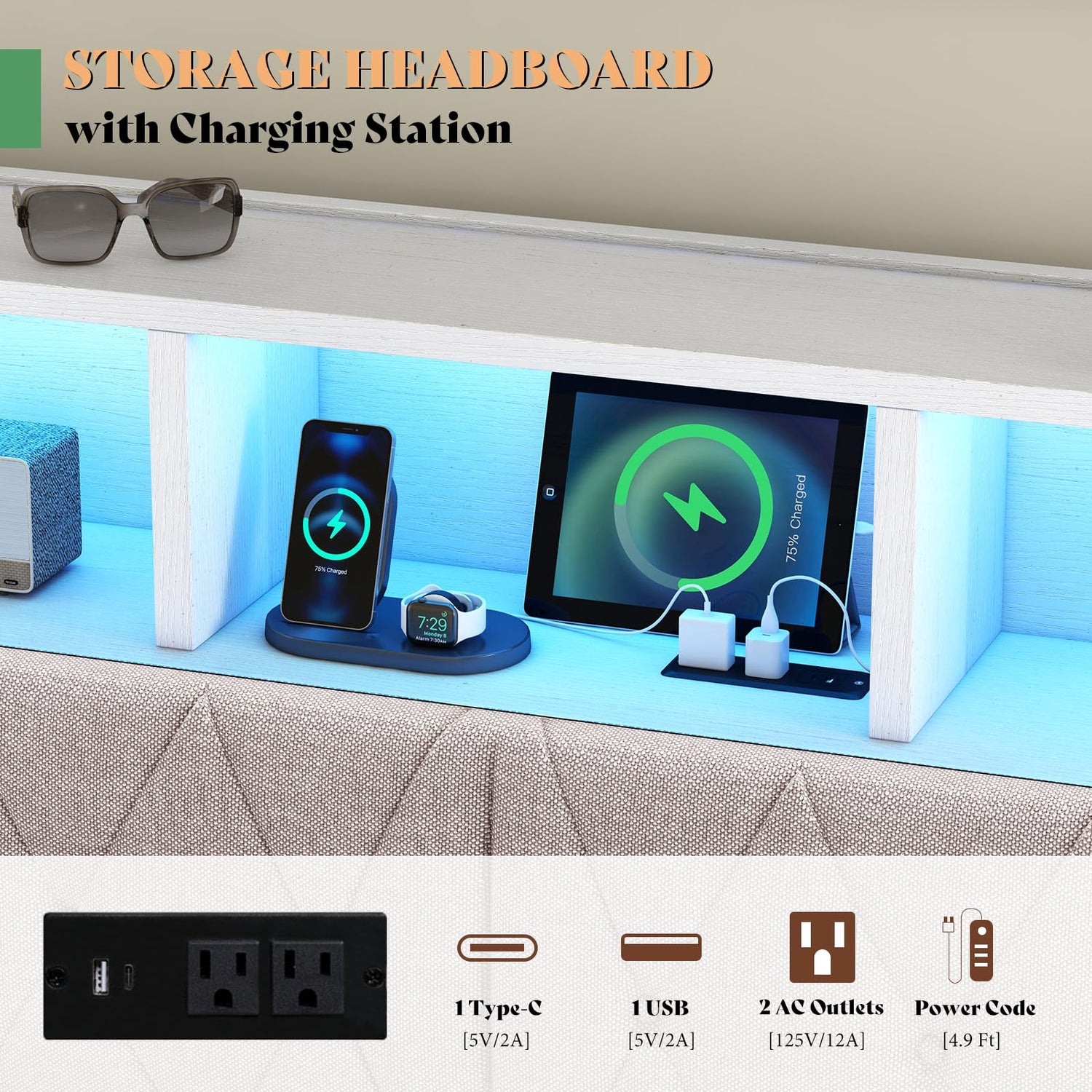- INCLUDED CHARGING STATION & LED LIGHTS: The bedframe cleverly integrates 2 AC outlets & 1 USB port and 1 Type-C port to meet your electronic device charging needs. Multi-color RGB LED lights create a personalized atmosphere.