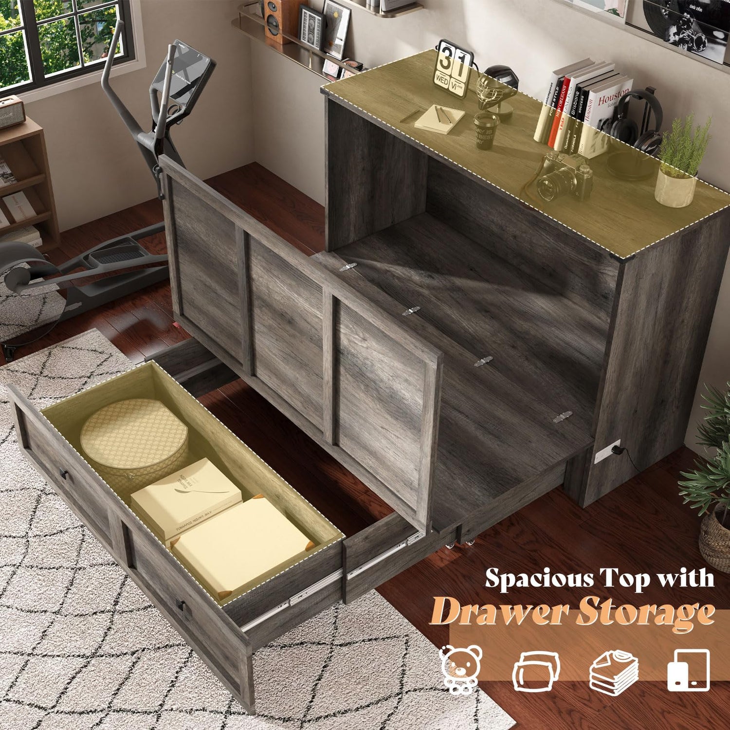 AMERLIFE Queen Murphy Bed with Storage & Charging Station, Farmhouse Murphy Cabinet with Foldable Panel, Noisy Free, for Living Room, Guest Bedroom, Office, Rustic Gray