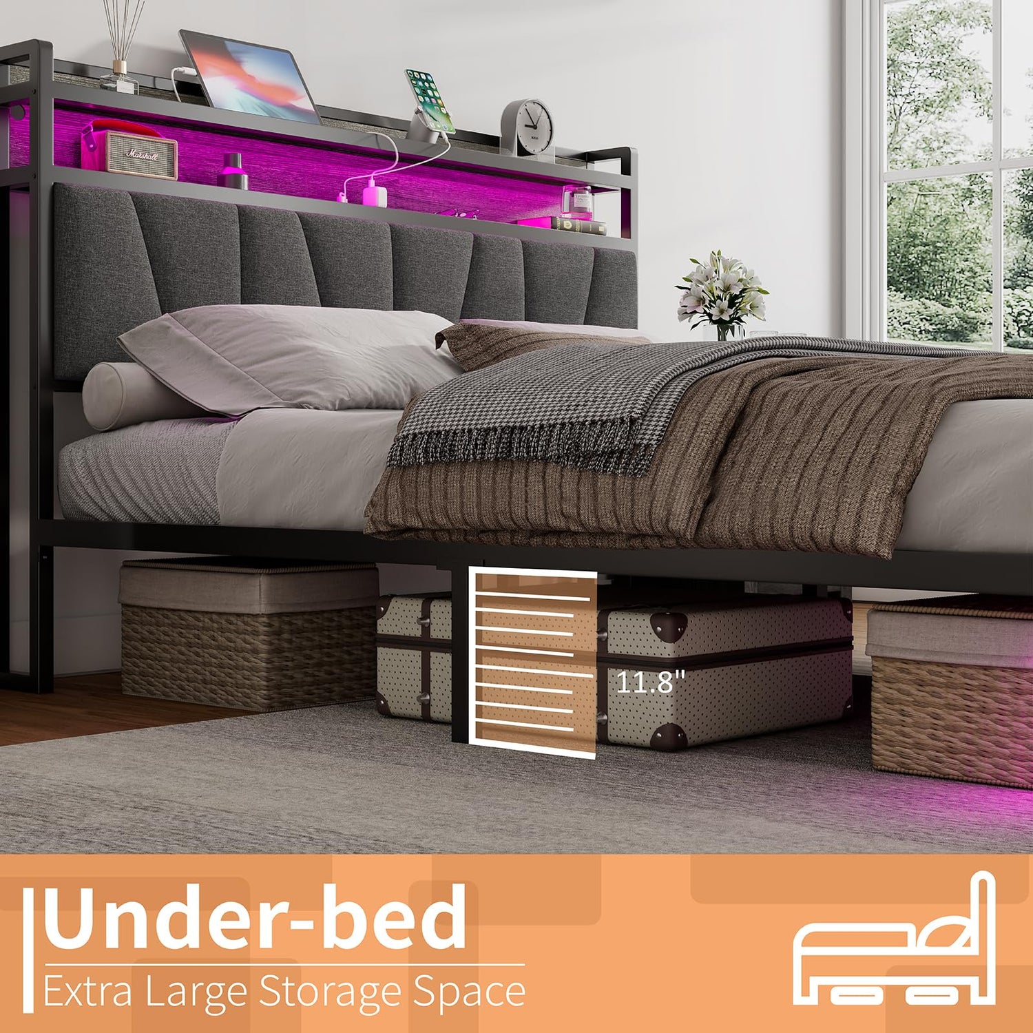 AMERLIFE Queen Size Bed Frame with RGB Lights & Charging Station, LED Bed Frame with Storage Headboard Linen Upholstered, Heavy Duty Metal Slats, No Box Spring Needed, Rustic Grey