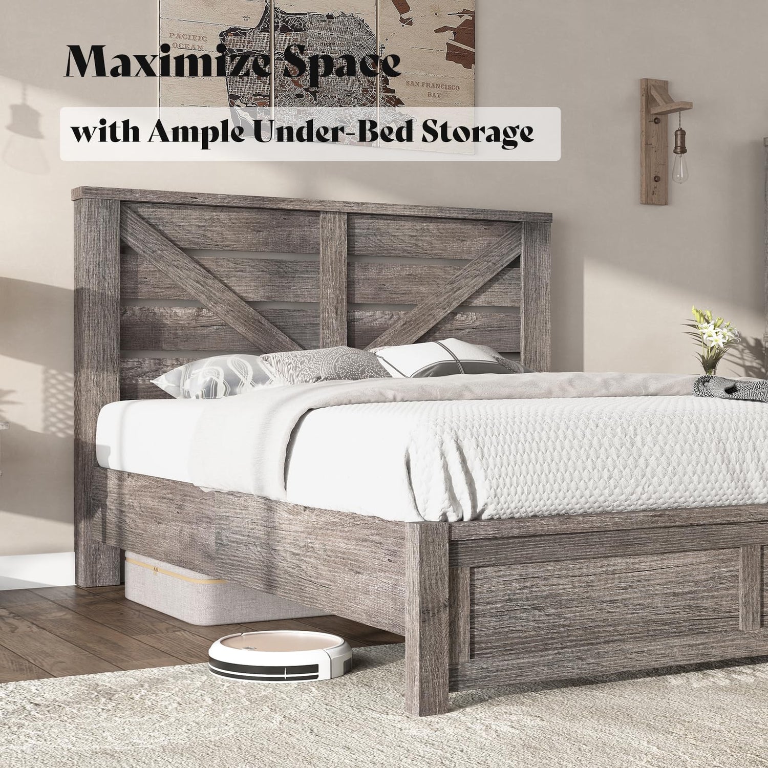 AMERLIFE Queen Size Farmhouse Bed Frame with 49.2" Barn Door Headboard, Platform Bed Frame with Wood Slats, Under Bed Storage Space, Easy Assembly, Noisy Free, Rustic Gray