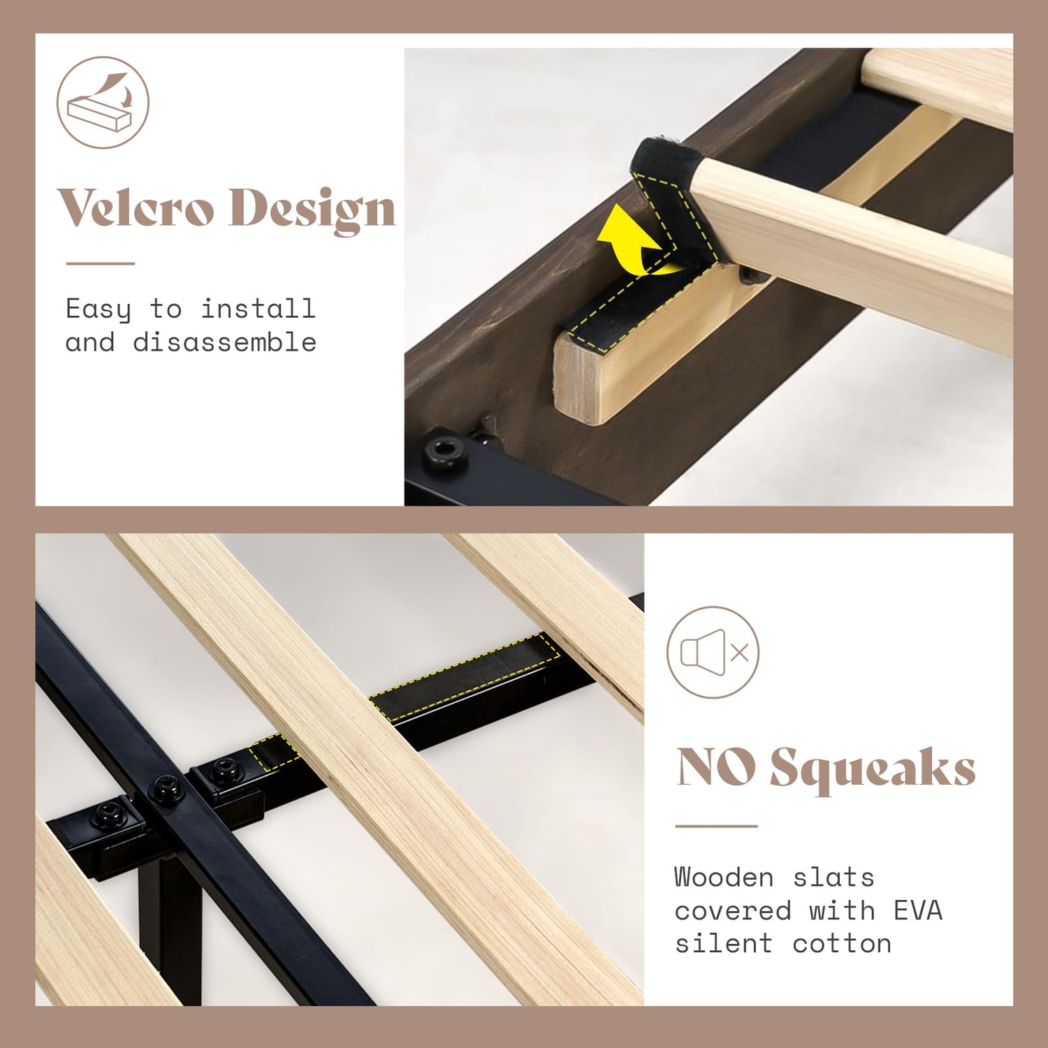 Designed for stability, the sturdy wooden slats paired with robust metal poles ensure excellent mattress support. Say goodbye to the hassle of box springs, as this bed frame is ready to accommodate your mattress seamlessly. The surface is generously covered with silent cotton, allowing you to enjoy a peaceful night's sleep without any annoying squeaks.