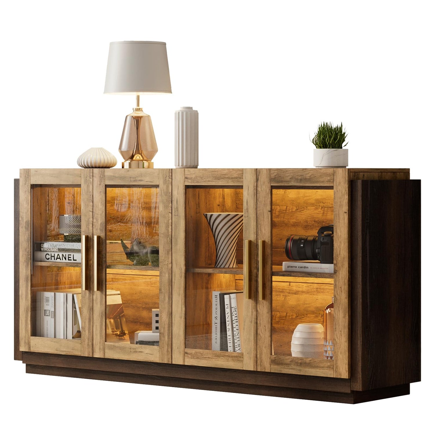 AMERLIFE Sideboard Buffet Cabinet, Mixed Color Accent Cabinet with LED Lights, Modern Glass Doors Storage Cabinet with Adjustable Shelf, Console Table for Dining, Living Room, Barnwood&Brown