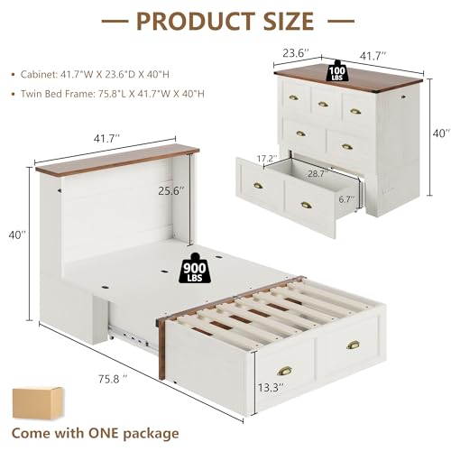 AMERLIFE Twin Size Murphy Bed, Farmhouse Wooden Cabinet with Charging Station and Storage Drawer for Bedroom/Office/Guest Room, White+Barnwood