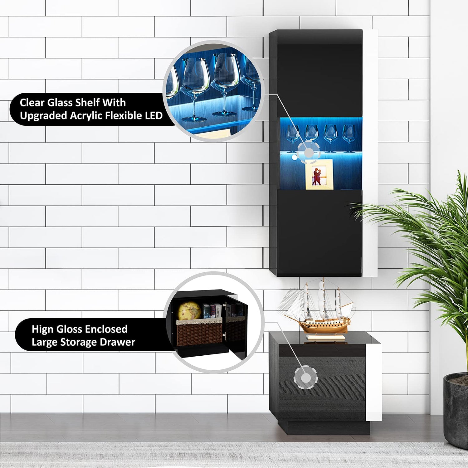- 2 x Floating Bookcase with clear glass shelf and 20 colors LED add luxury and modernity. 2 x Side Table provide extra storage space. Perfect for those in need of living room decor & storage space