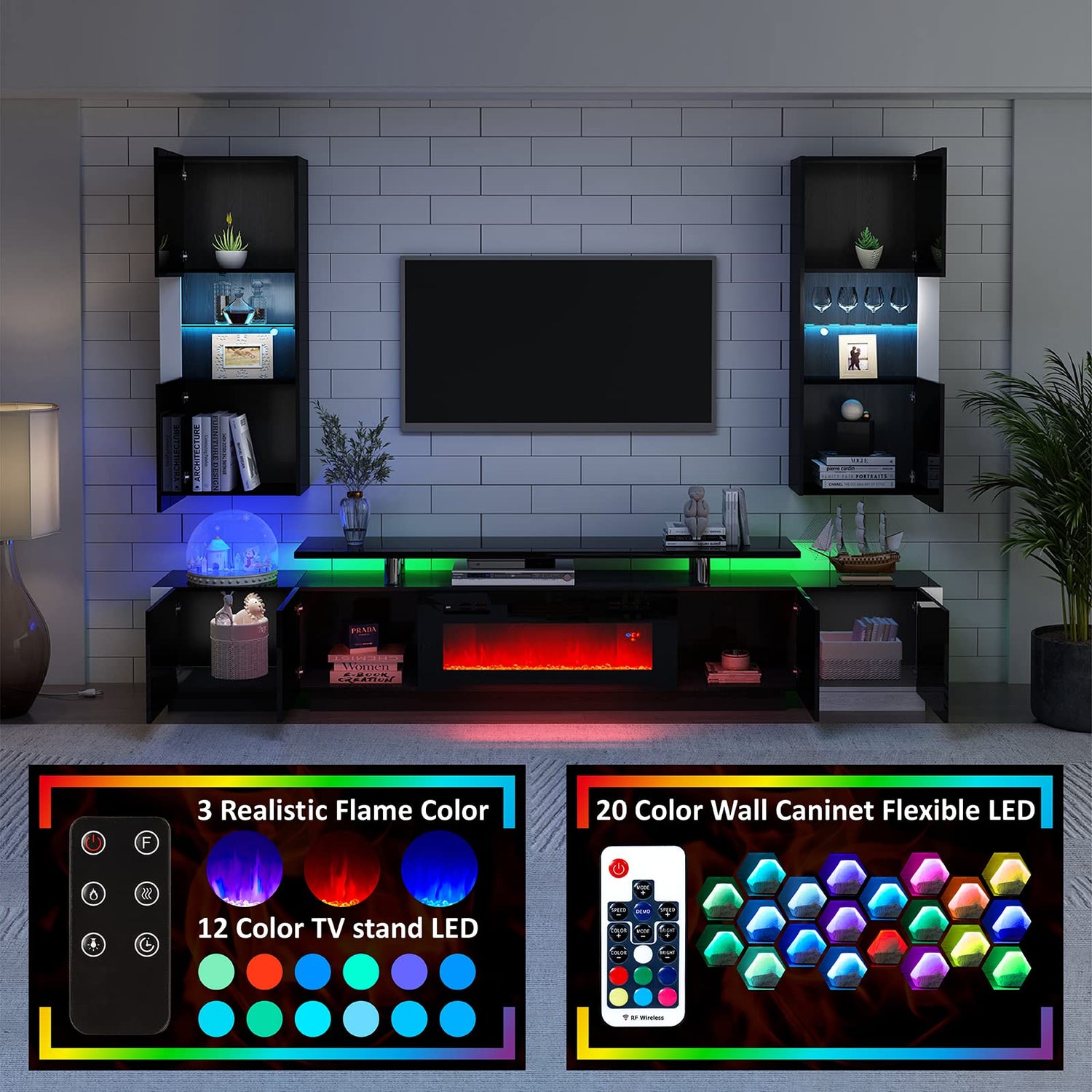 - 70" 2-tier TV console with 36" multi-functional electric fireplace features 3 colors realistic flame & 5 levels brightness & 12 colors LED light customize the personalized lighting atmosphere