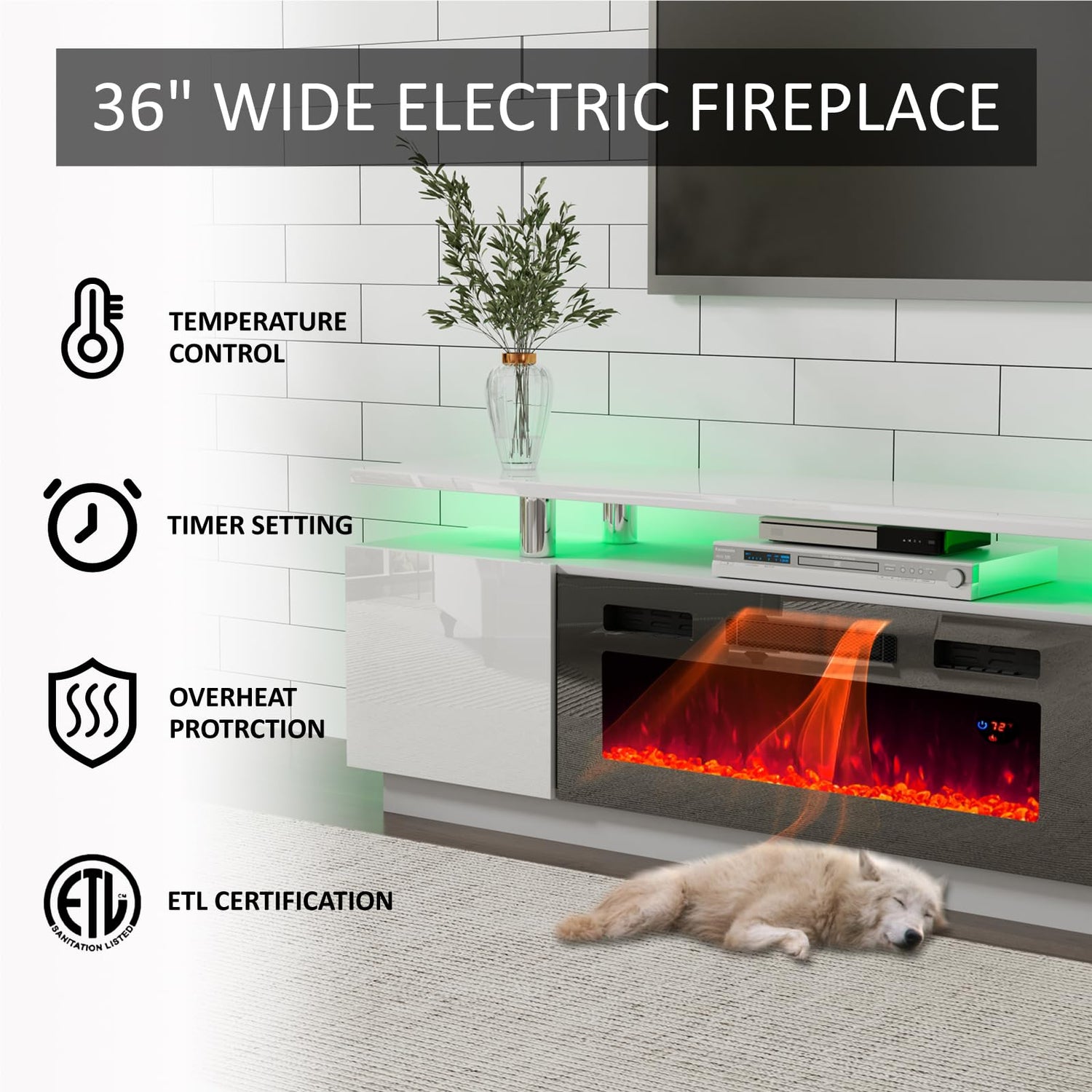 - 70" 2-tier TV console with 36" multi-functional electric fireplace features 3 colors realistic flame & 5 levels brightness & 12 colors LED light customize the personalized lighting atmosphere