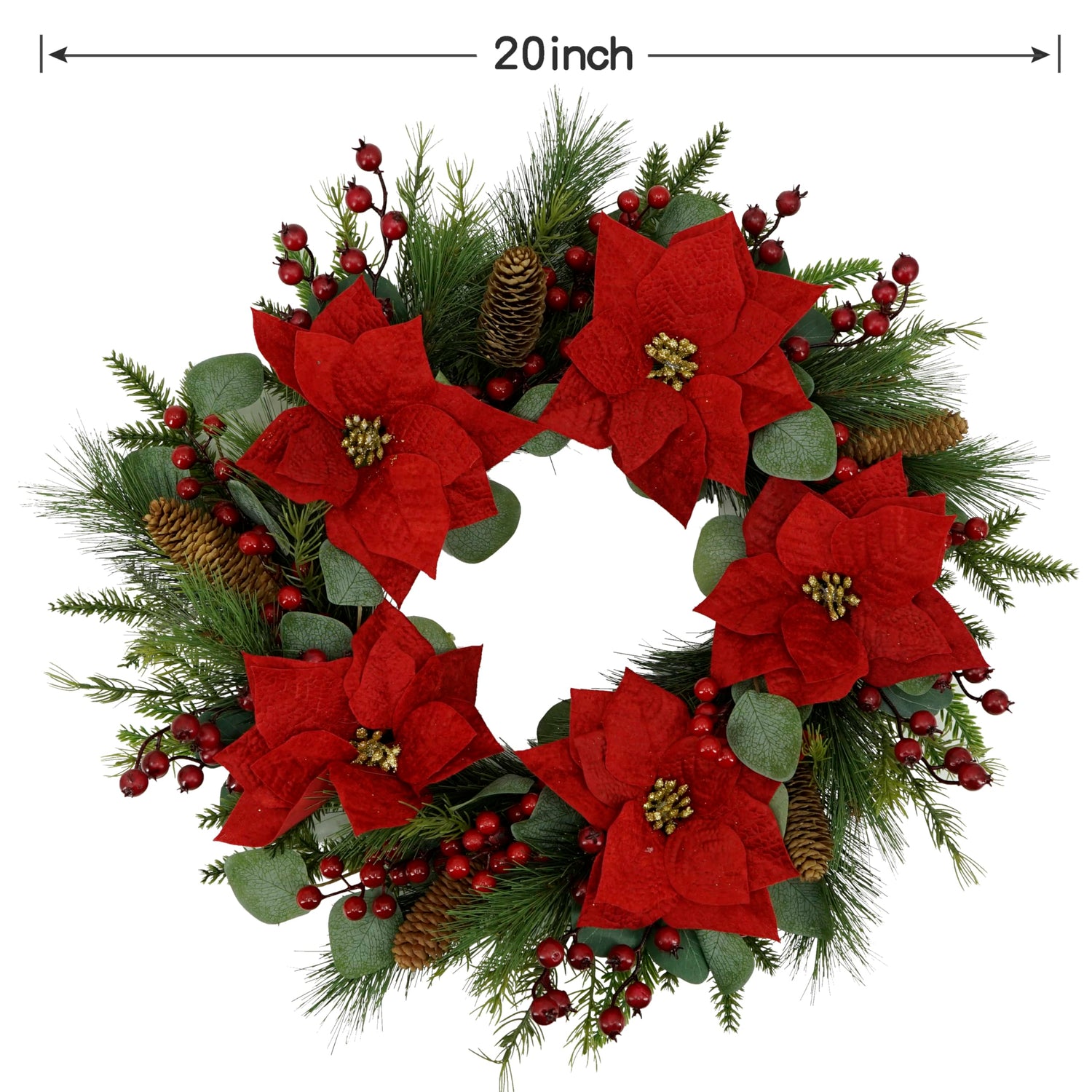 AMF0RESJ 20 inch Artificial Christmas Wreath Winter Wreath with Poinsettia,Eucalyptus Leaves,red Berry,Pine Cones,Pine Needles for Indoor Outdoor Farmhouse Home Wall Window Festival Wedding Decor