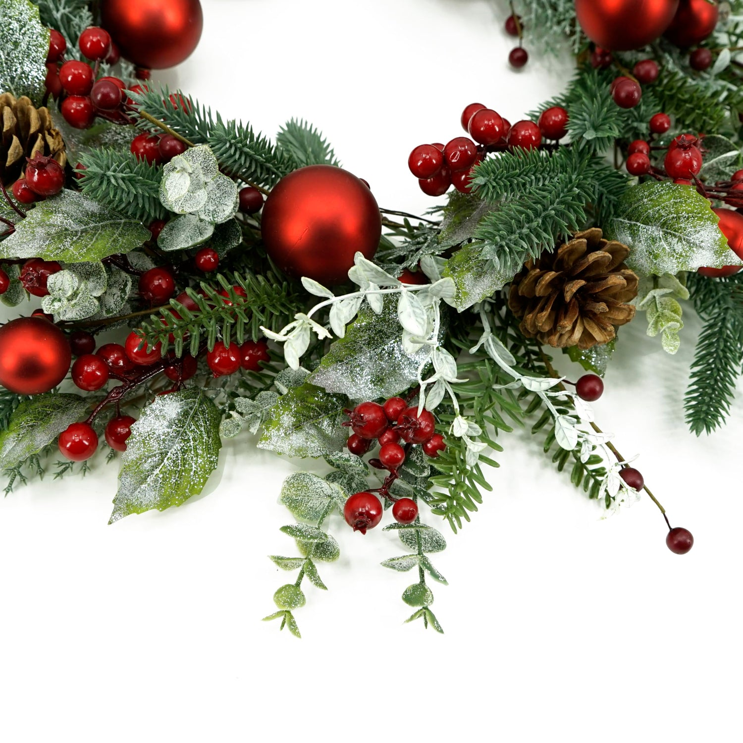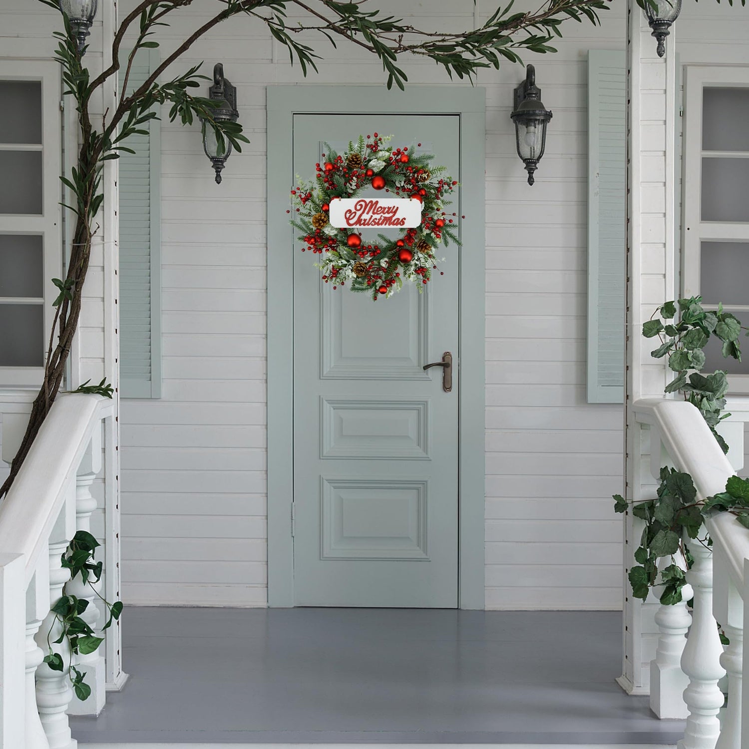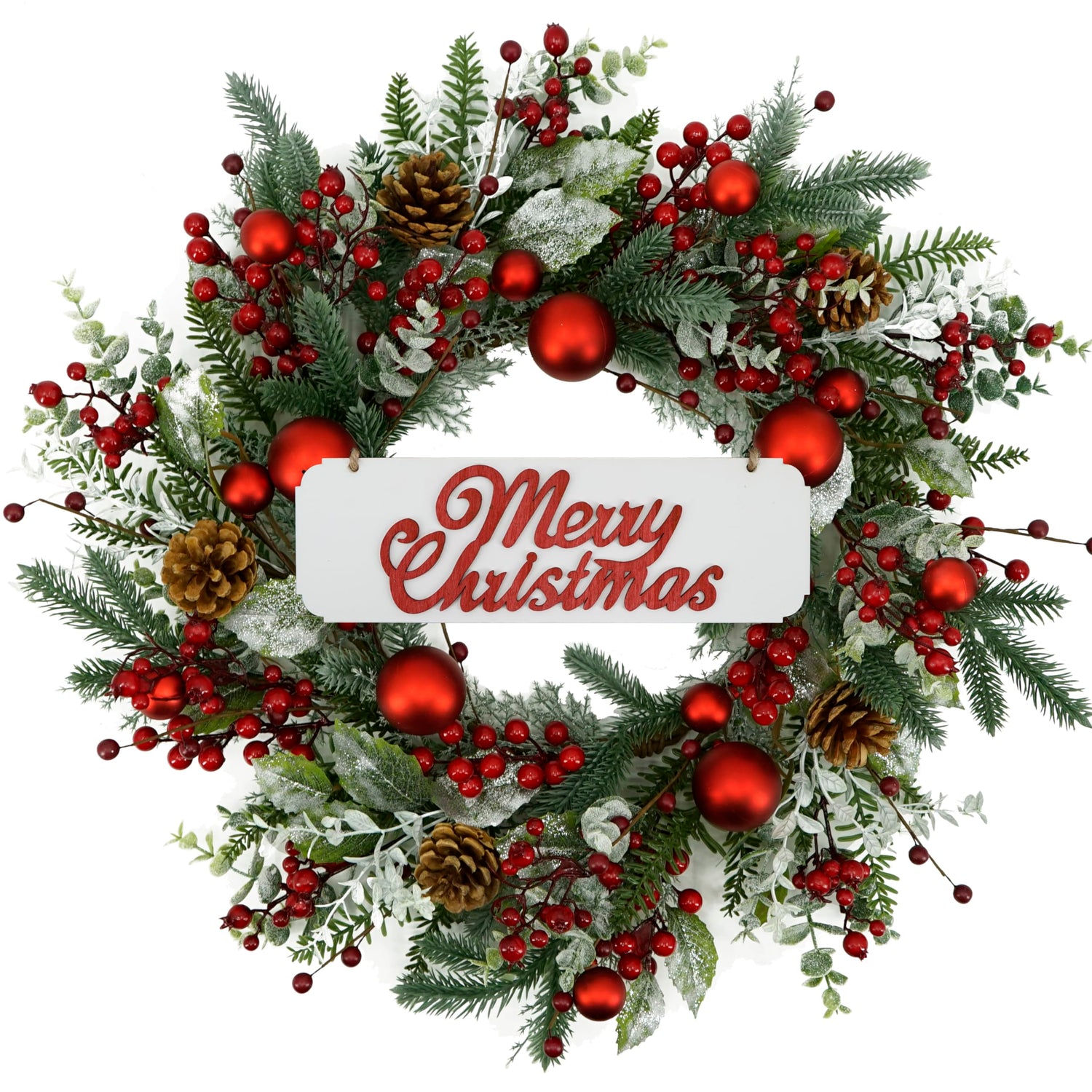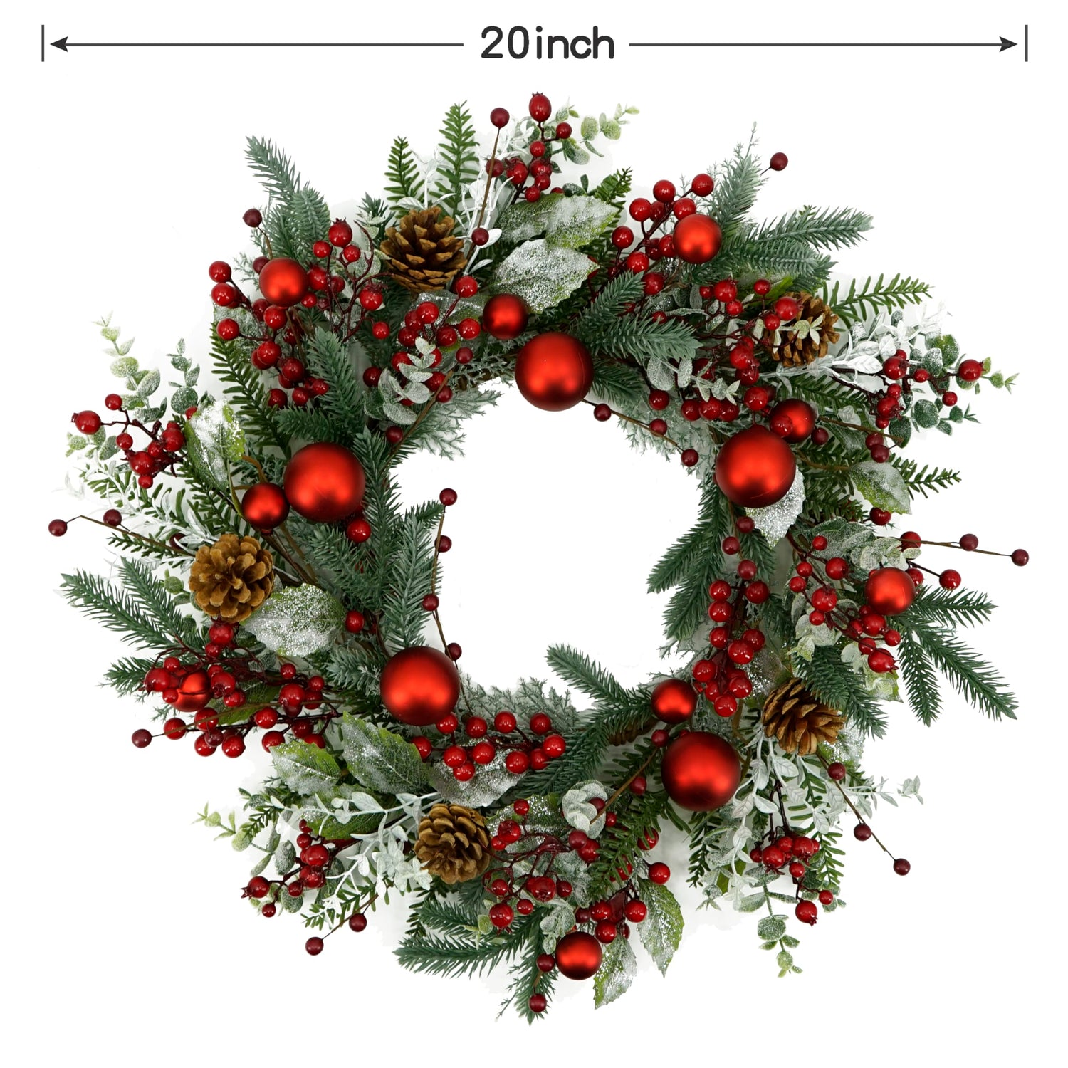 AMF0RESJ 20 inch Artificial Christmas Wreath Winter Wreath with red Ball,red Berry,Pine Needles for Indoor Outdoor Farmhouse Home Wall Window Festival Wedding Decor
