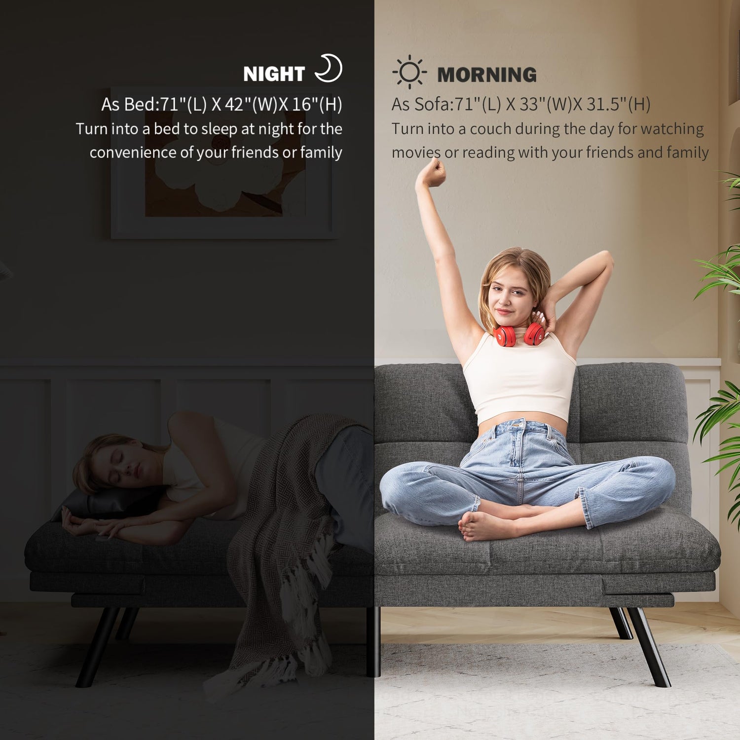 - 【Perfect for Small Space】: Our futon sofa bed is perfect for any room in your home. Use as a sofa: 71 inches (L) X 33 inches (W) X 31.5 inches (H). Convert into a bed: 71 inches (L) X 42 inches (W) X 16 inches (H). Boasting an impressive weight capacity of up to 600 lbs, this sofa bed can easily handle daily use without compromising on its stability and durability, it can be used in living rooms, bedrooms, offices, dormitories and other small spaces.