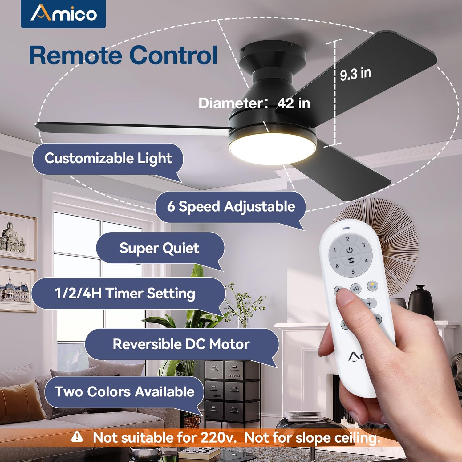 Amico Ceiling Fans with Lights, 42 inch Low Profile Ceiling Fan with Light and Remote Control, Flush Mount, Reversible, 3CCT, Dimmable, Noiseless, Black Ceiling Fan for Bedroom, Indoor/Outdoor Use