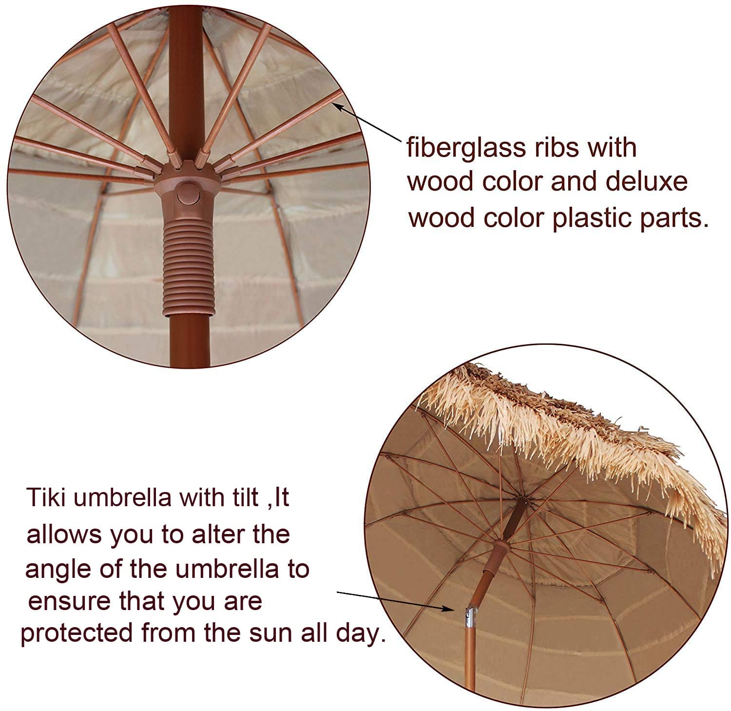 Details: Product Features: Ammsun 7.5ft beach Umbrella Hawaiian Style straw umbrella with 10 ribs, Natural Color. With iron tilt to maximize your shade. Overall Height: 7.2ft(maximum) Canopy Diameter:7.5ft Fabric: solid nylon fabric +PP cover. Pole Diameter:1.26""/1.38"" steel pole Ribs:fiberglass rib, with zinc tilt Nylon fabric carry bag. Package Including: 1x umbrella 1x carry bag Attention: 1)All dimensions are measured by hand, there may be 0.4""-0.8"" deviations. 2) Due to the light and computer monitor vary, the color may be slightly different from our pictures. 3)The umbrella is mainly used to block the sun for a leisure time at the beach, instead of keeping out the invasion of the storm, so try to avoid the relatively bad weather. 4)It features an adjustable tilt, a sturdy design for long lasting use, and is compact enough for shade on the beach . One Year Manufacturer's Warranty. Or you can directly contact us, when you meet with quality problems.