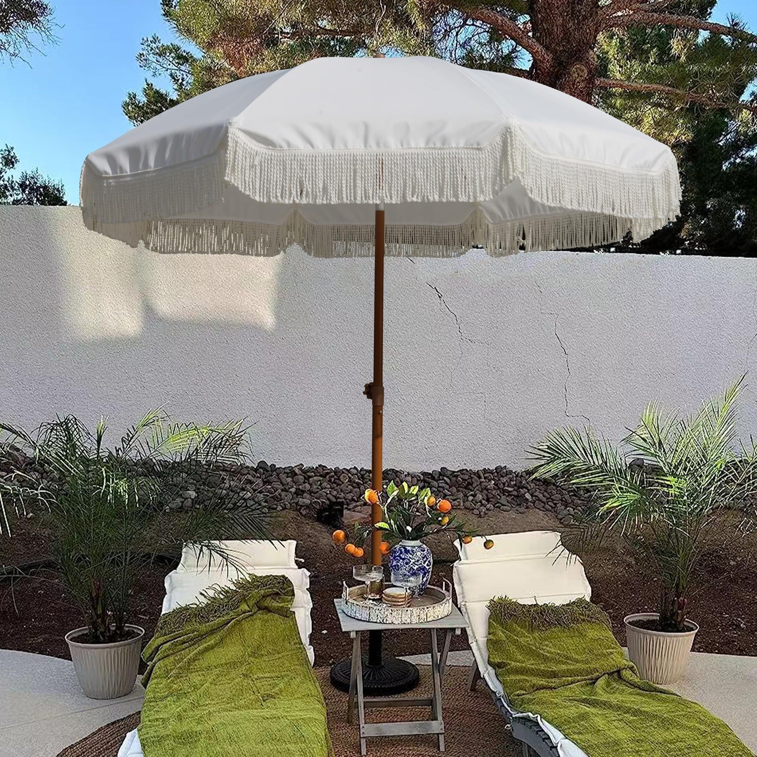 AMMSUN 7ft Patio Umbrella with Fringe Outdoor Tassel Umbrella UPF50+ Premium Steel Pole and Ribs Push Button Tilt, White Cream
