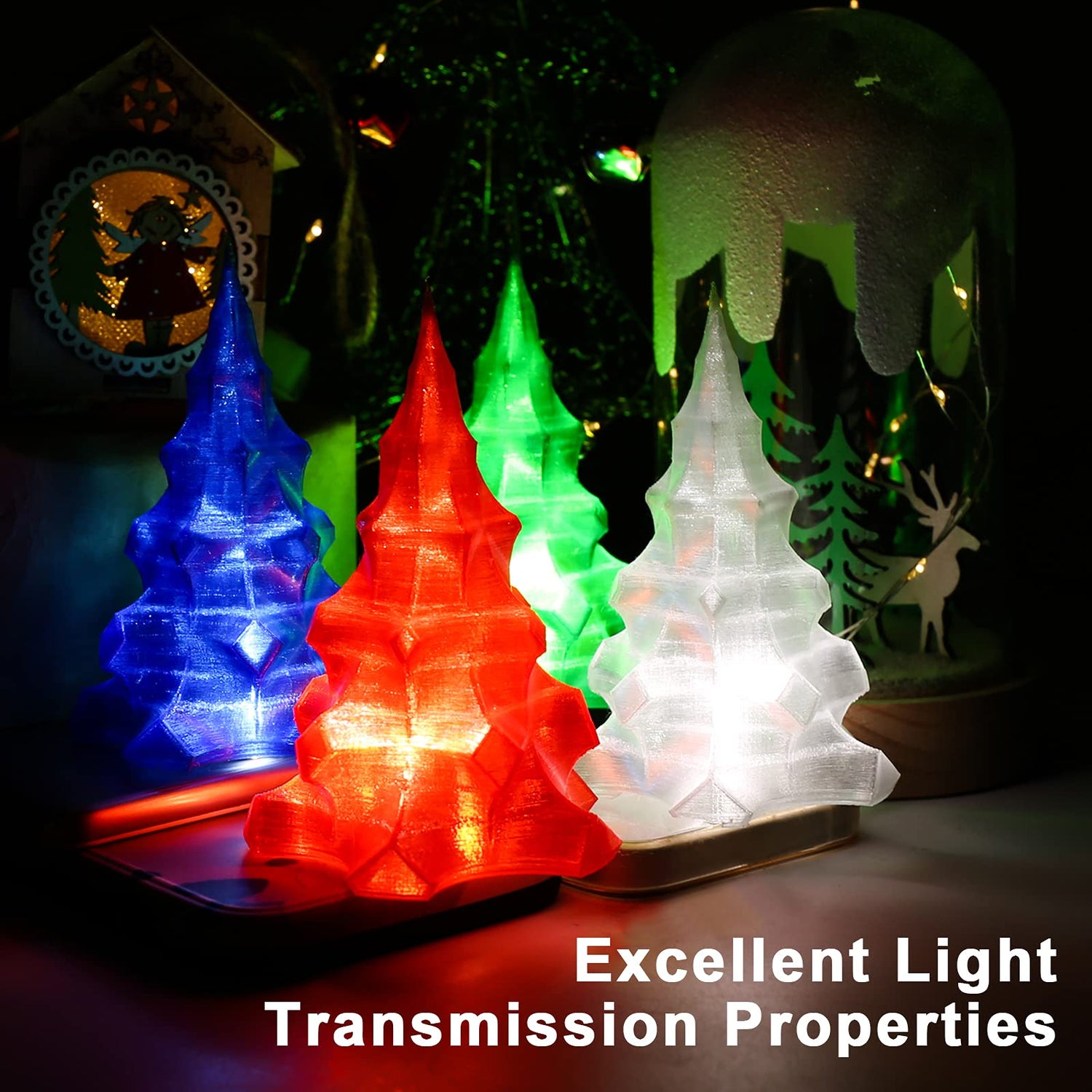 - 【LIGHT TRANSMISSION FEATURE】 - This transparent PETG filament Bundle have light transmission properties, PETG is uniform and soft with strong light penetration in the translucent colors. Different thickness of the outer wall shows different light transmission effects. It’s a suitable choice for printing lamps, lampshade, Vase or Christmas tree at all.