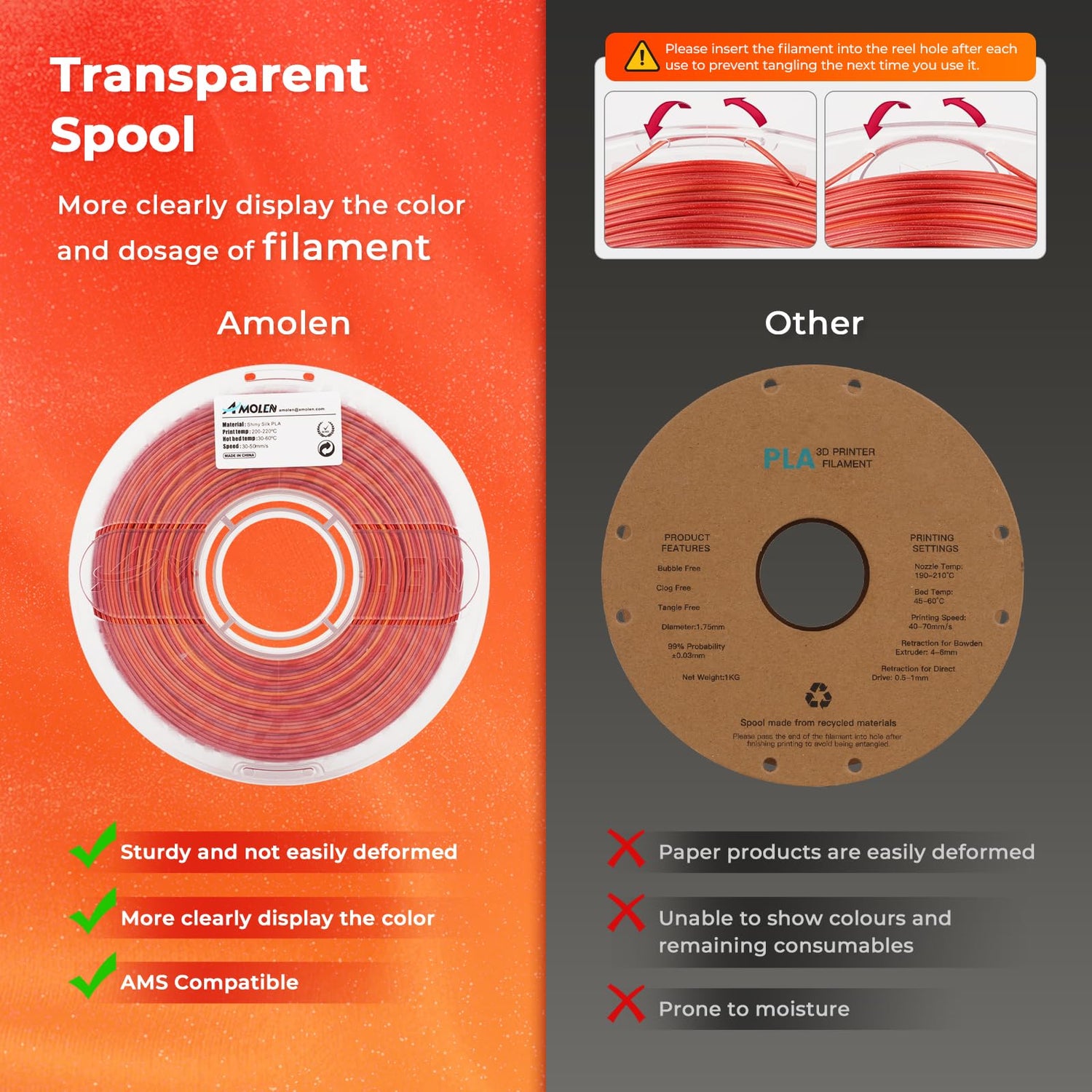 - Silk PLA Shiny Filament - AMOLEN gradient silk pla filament combine silk gold and shiny red, stunning multicolor filament, print finished will give you an amazing 3D printing object. Multicolor PLA Filament normally around 10-15 meters change color and is excellent for the larger prints to show all colors