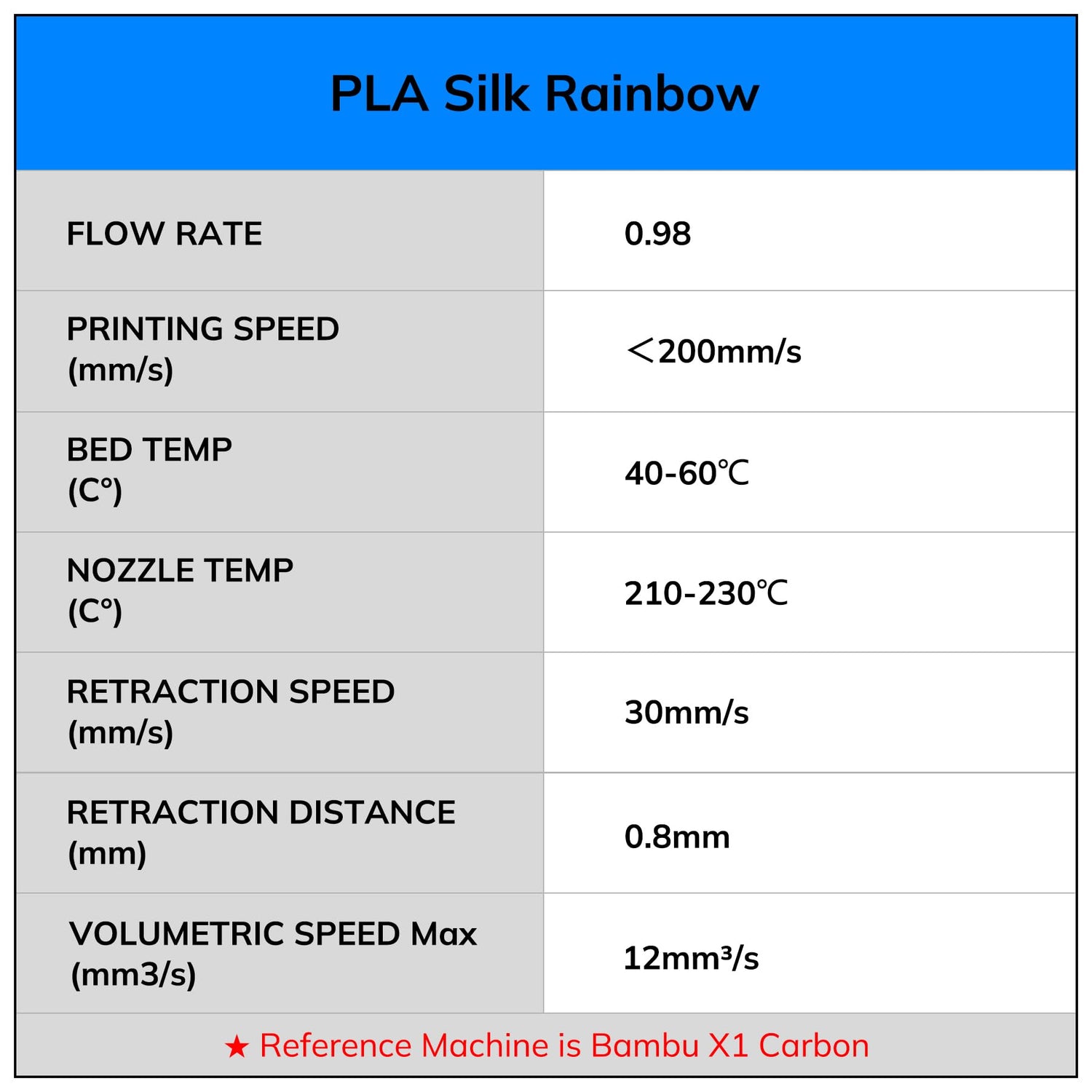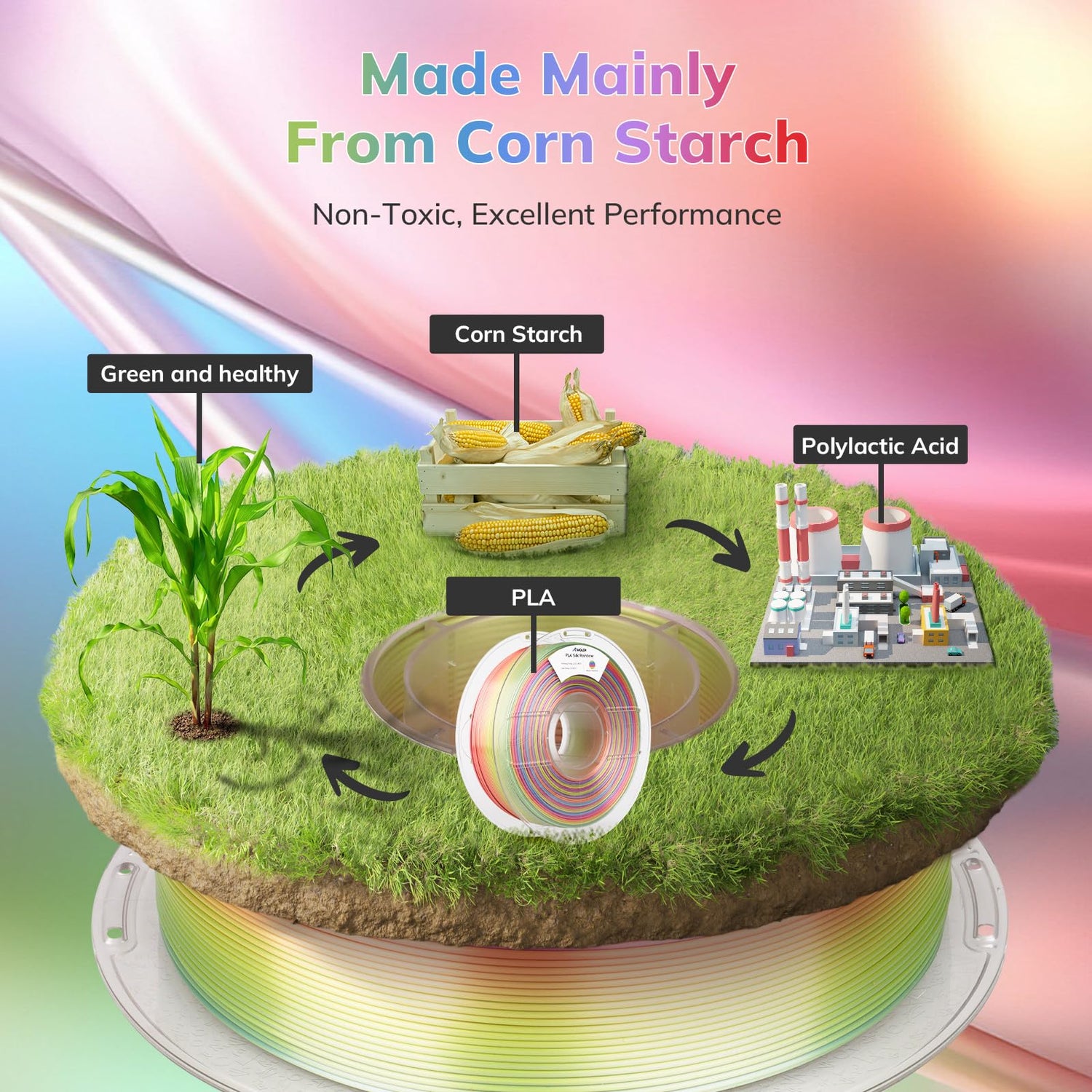 - 【 Multicolor Silk Rainbow PLA】Silk Bloom Rainbow PLA filament delivers an eye-catching and smooth finish, making your 3d prints stand out from the crowd. Gradient Pink Blue Purple Green Yellow color change rainbow, around 10m change one. Shiny multicolor rainbow combination of magic 1.75mm PLA filament, fullfill your artistic creation