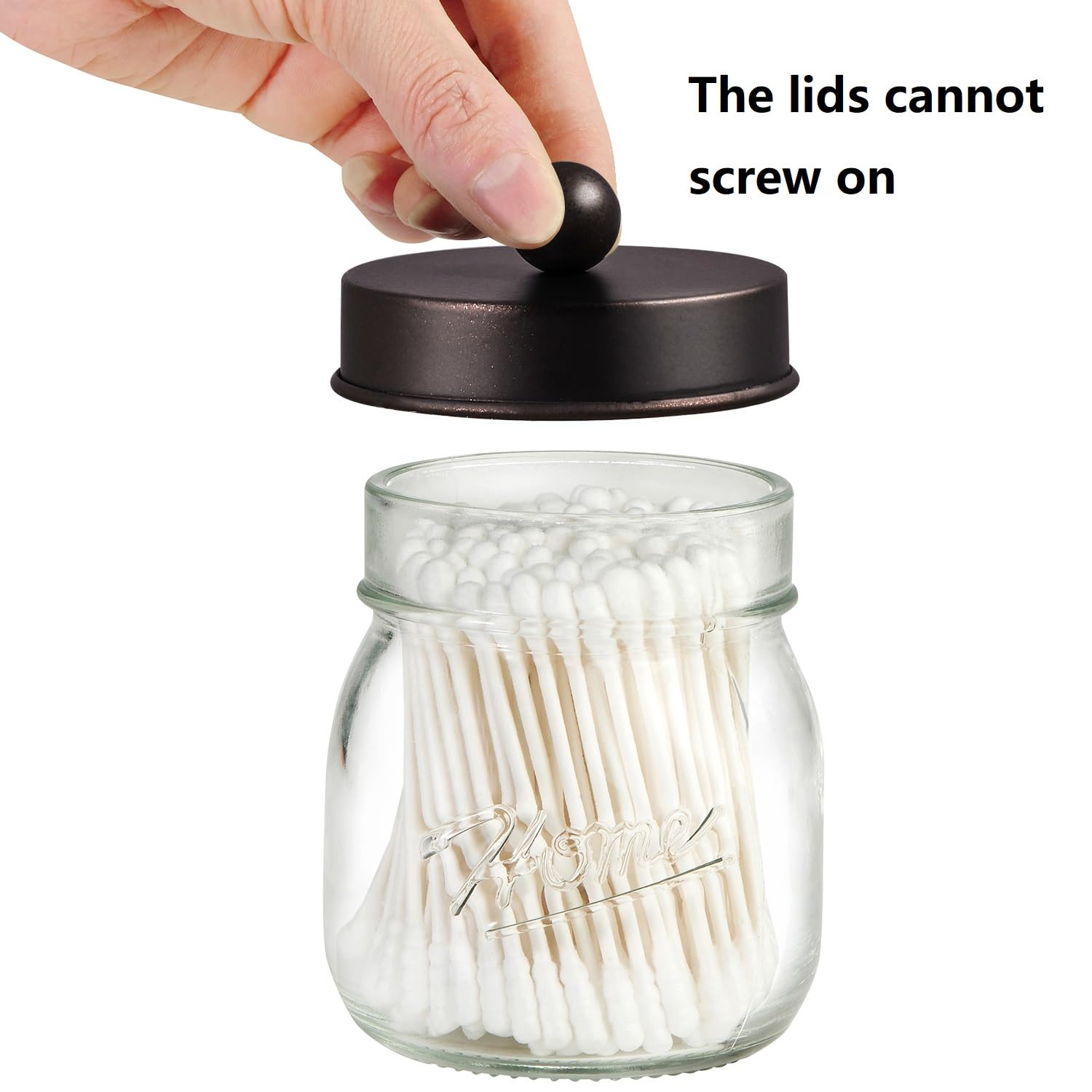 - 2 CUTE APOTHECARY JARS -8 oz regular mouth mason jar qtip holder adds the perfect rustic charm to your bath-room.The lids are metal, rust-proof ;The jars are not sealed so you can access the items inside with one hand easily . The mason storage jars are great for cotton swabs, q-tips, cotton balls, cotton rounds,hair bands or any other bathroom necessities and accessories,but also great in home office for paperclips, rubber bands, binder clips, etc(๐๐ก๐ ๐ฅ๐ข๐๐ฌ ๐a๐ง'๐ญ ๐ฌ๐๐ซ๐๐ฐ ๐จ๐ง)