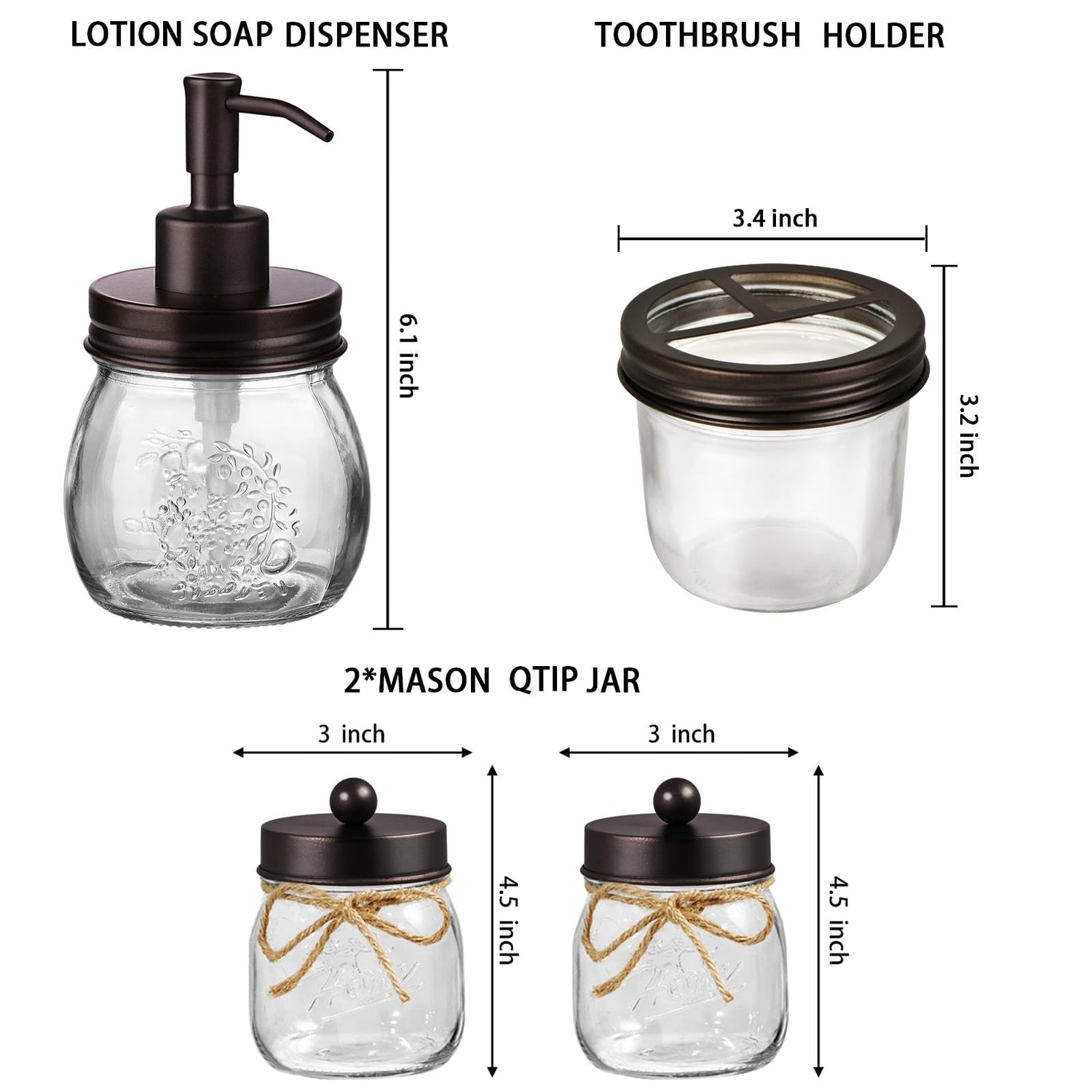 Amolliar Mason Jar Bathroom Accessories Set 4 Pcs -Lotion Soap Dispenser & 2 Qtip Holders & Toothbrush Holder - Rustic Farmhouse Decor, Bathroom Home Decor (Bronze)