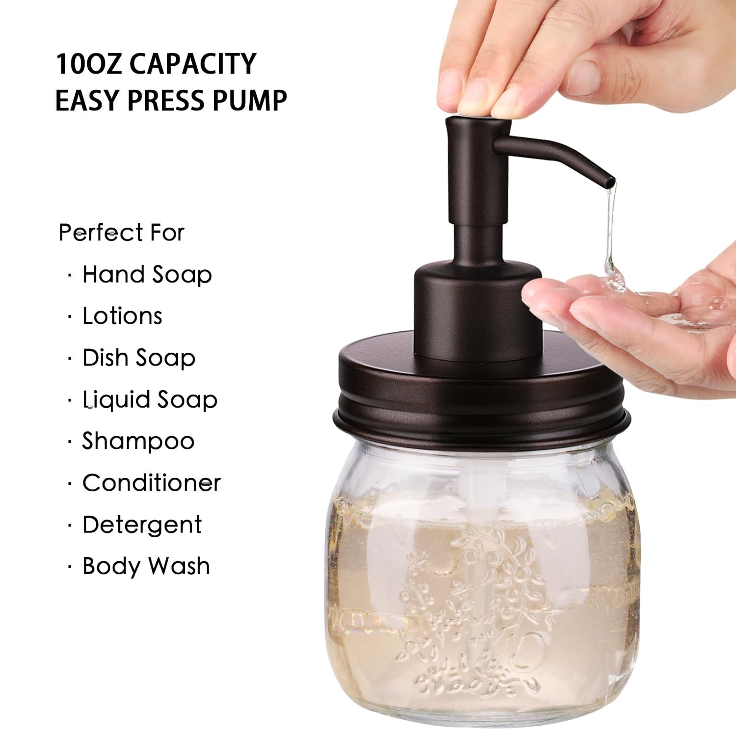 - RUSTPROOF STAINLESS STEEL LOTION SOAP DISPENSER - The 10 oz Pint regular mouth pint mason jar are made from high quality lead-free glass.The pump is able to handle thick liquids like dense conditioner, liquid soap, dish soap, Lotions, etc.The dip tube and interior parts are BPA-free.The pump contains a leak-proof gasket that does not leak out even if the bottle is tilted.Reusable, refillable,eco-friendly to the environment as well as your budget.