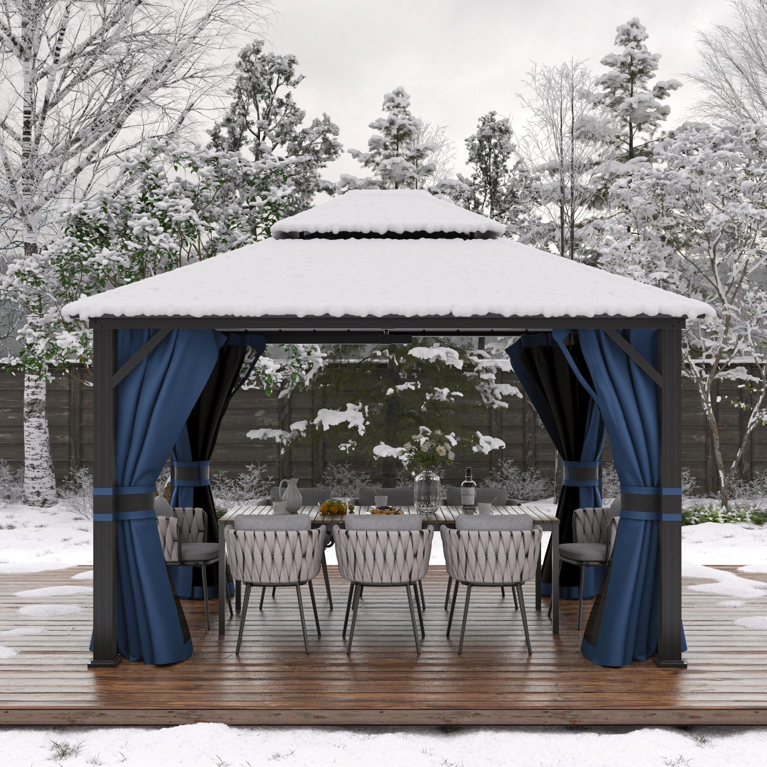 Amopatio 10' X 12' Hardtop Gazebo, Permanent Aluminum Gazebo with Galvanized Steel Double Roof, Outdoor Metal Gazebos with Curtain and Netting for Patio, Deck and Backyard, Blue