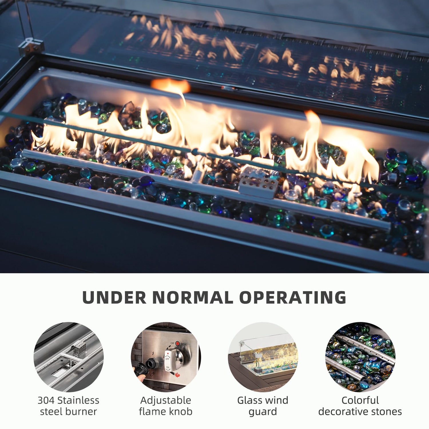 - 【CSA Certified Efficiency】Our CSA-certified fire pit table boasts a high-performance, 304 stainless steel burner that promises evenly distributed, long-lasting flames with a guarantee of no smoke or pollution. The convenient, built-in push-button ignition system allows for effortless startup and swift flame height adjustments. Enhanced with eye-catching glass beads and a protective wind-proof glass cover, this fire pit table not only showcases dazzling flames but also ensures a steady output.
