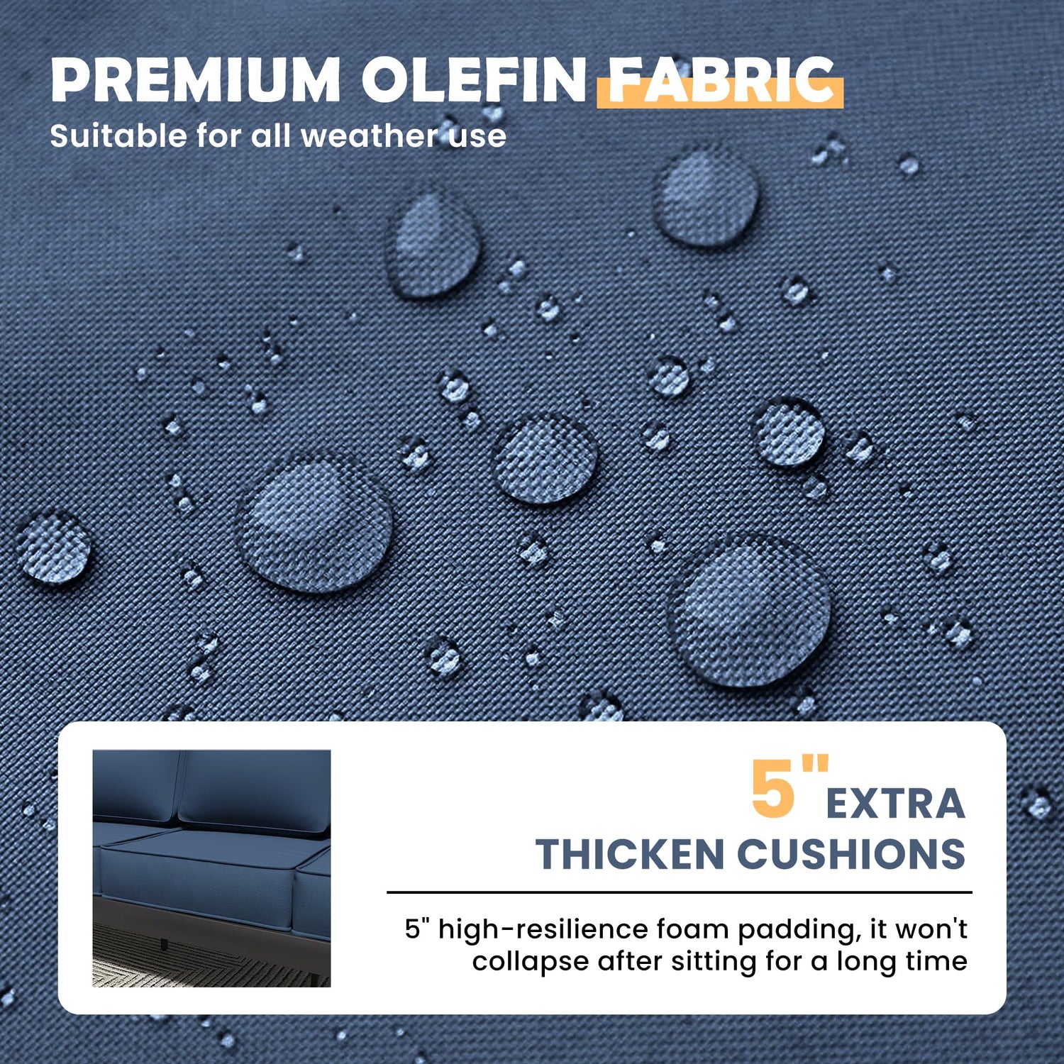 - 🏡【5 INCH OLEFIN SEAT CUSHION】: Our patio furniture set comes with 5-inch thick cushion, the cushion cover is made of upgraded Olefin fabric which is soft, breathable and fade-resistant. The high-density sponge can reduce the tiredness when sitting for a long time and let yourself be immersed in a comfortable environment. With a zipper design, the cushion cover is removable.The bottom of the cushion is designed with anti-skid particles, which can ensure that it will not slide away when sitting.