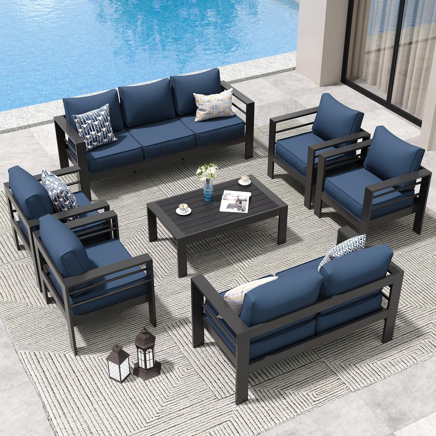- 🏡【UPGRADED ALL-ALUMINUM FRAME】: This modern patio furniture set is made of a premium aluminum frame, which is both strong and lightweight. Compared with ordinary iron/steel furniture, the aluminum outdoor patio furniture set is anti-fade, anti-rust, anti-corrosion in all kinds of weather. It will last you for years to come!
