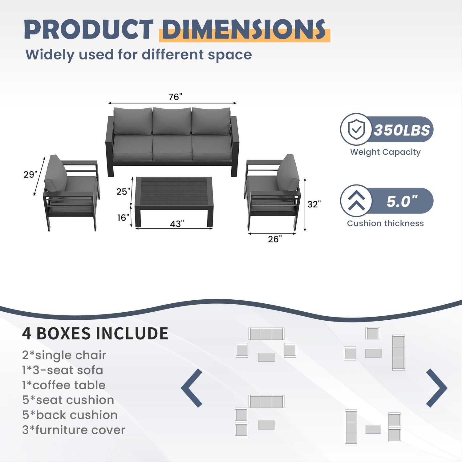 - 🏡【UPGRADED ALL-ALUMINUM FRAME】: This modern patio furniture set is made of a premium aluminum frame, which is both strong and lightweight. Compared with ordinary iron/steel furniture, the aluminum outdoor patio furniture set is anti-fade, anti-rust, anti-corrosion in all kinds of weather. It will last you for years to come!