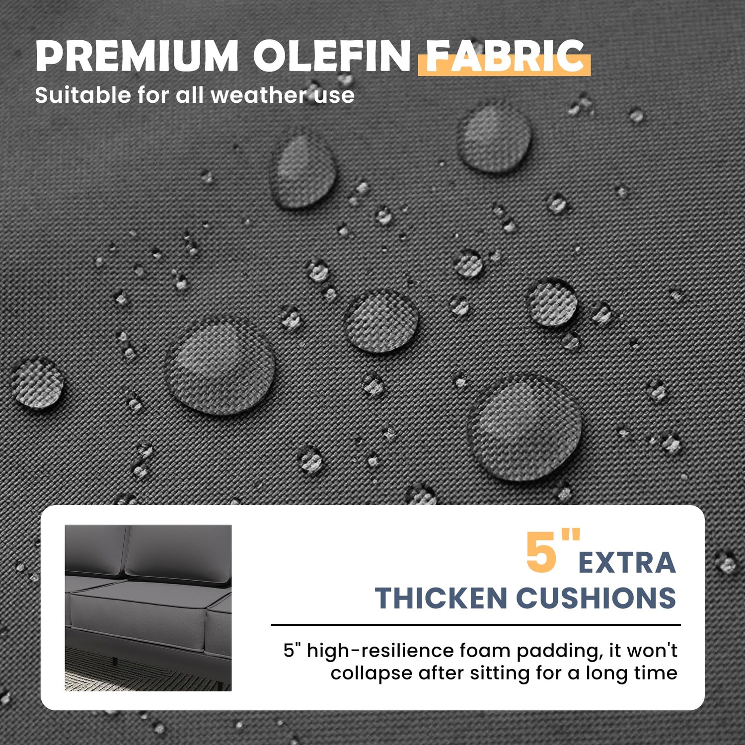 - 🏡【5 INCH OLEFIN SEAT CUSHION】: Our patio furniture set comes with 5-inch thick cushion, the cushion cover is made of upgraded Olefin fabric which is soft, breathable and fade-resistant. The high-density sponge can reduce the tiredness when sitting for a long time and let yourself be immersed in a comfortable environment. With a zipper design, the cushion cover is removable.The bottom of the cushion is designed with anti-skid particles, which can ensure that it will not slide away when sitting.