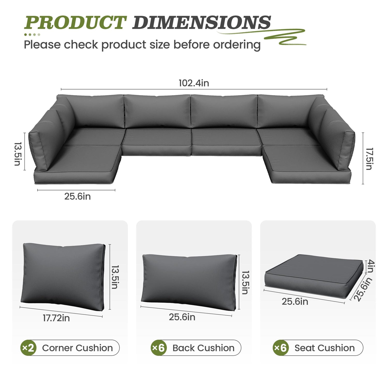 - 🥑【Sizes & Combinations】🥑This patio furniture cushions is suitable for various 6-seat cushions for outdoor furniture. Outdoor replacement cushions packed in 1 box, contains 6 patio seat cushions, 6 backrest pillow, 2 corner backrest pillow.